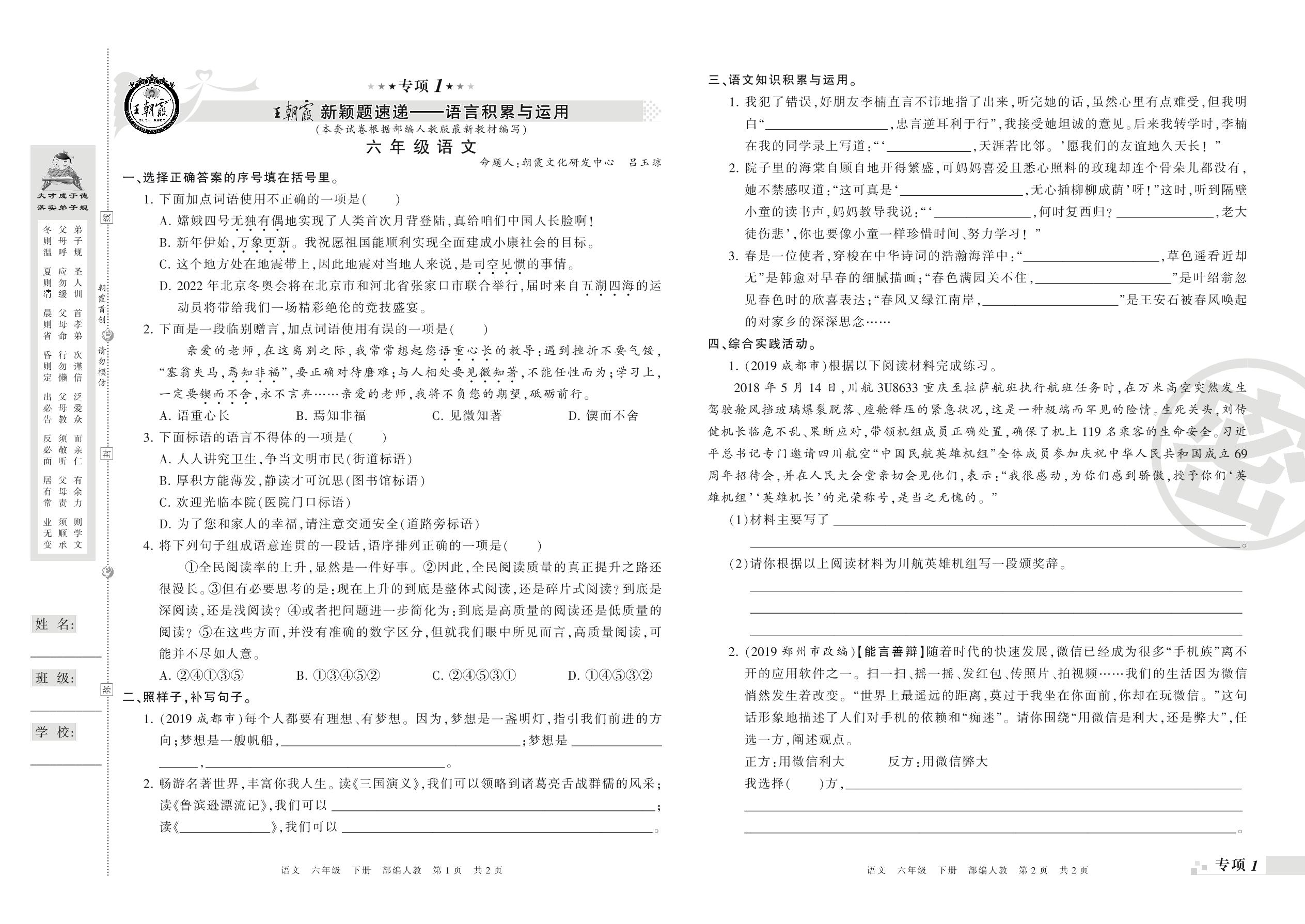 王朝霞期末专项卷——新颖题速递:语言积累与运用、非连续性文本阅读六年级下册语文(人教版)_R21080220452【0】