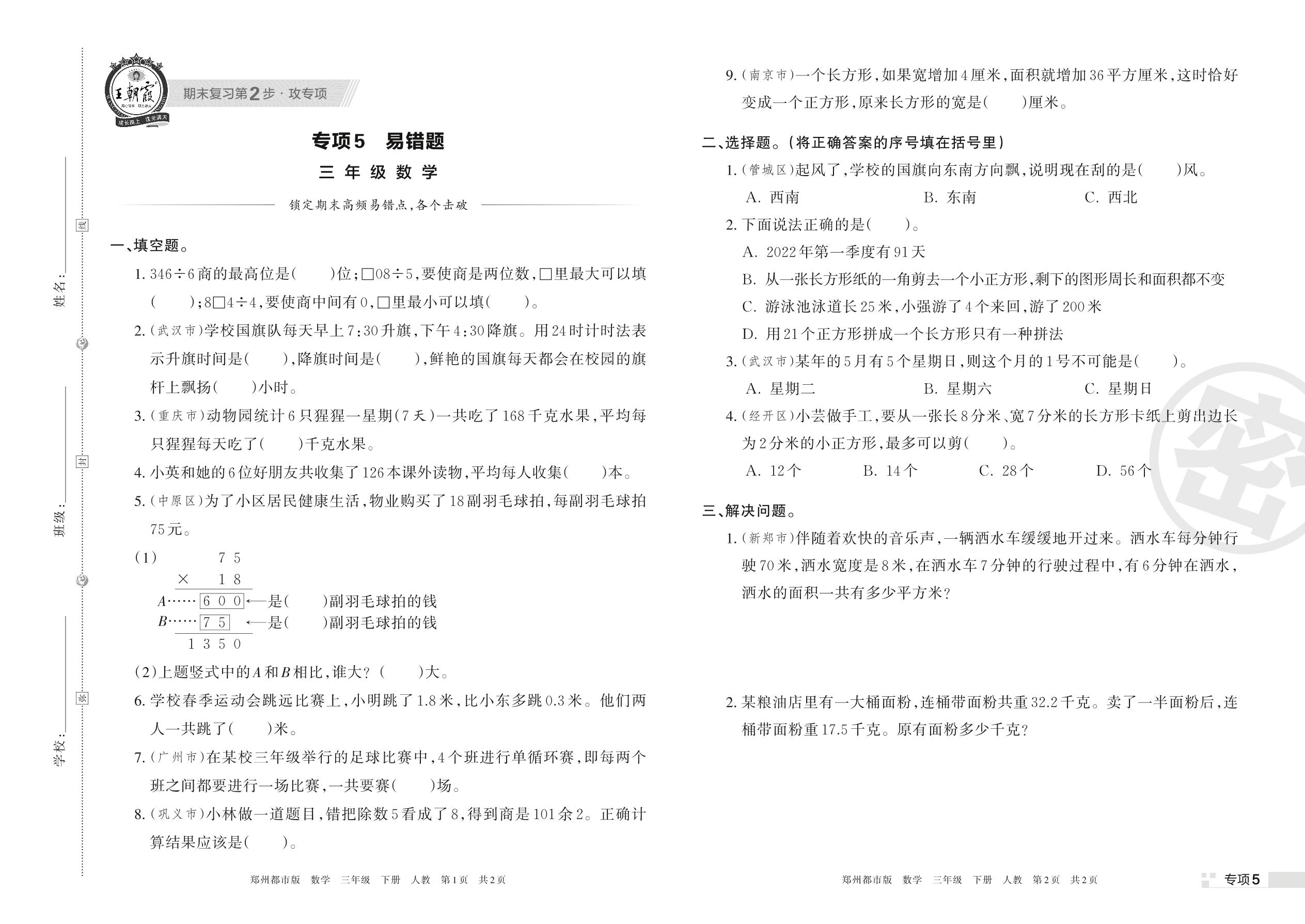 王朝霞期末专项卷——易错题三年级下册数学(人教版)_R220331141113158【5】