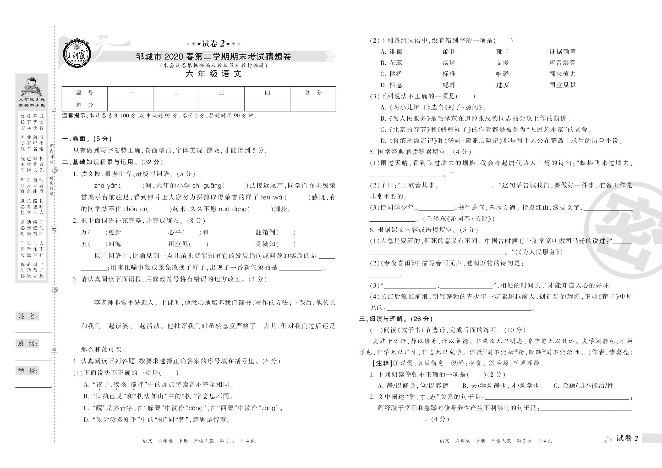 2018-2019学年第二学期邹城市猜想卷六年级语文试卷(人教版)【2】