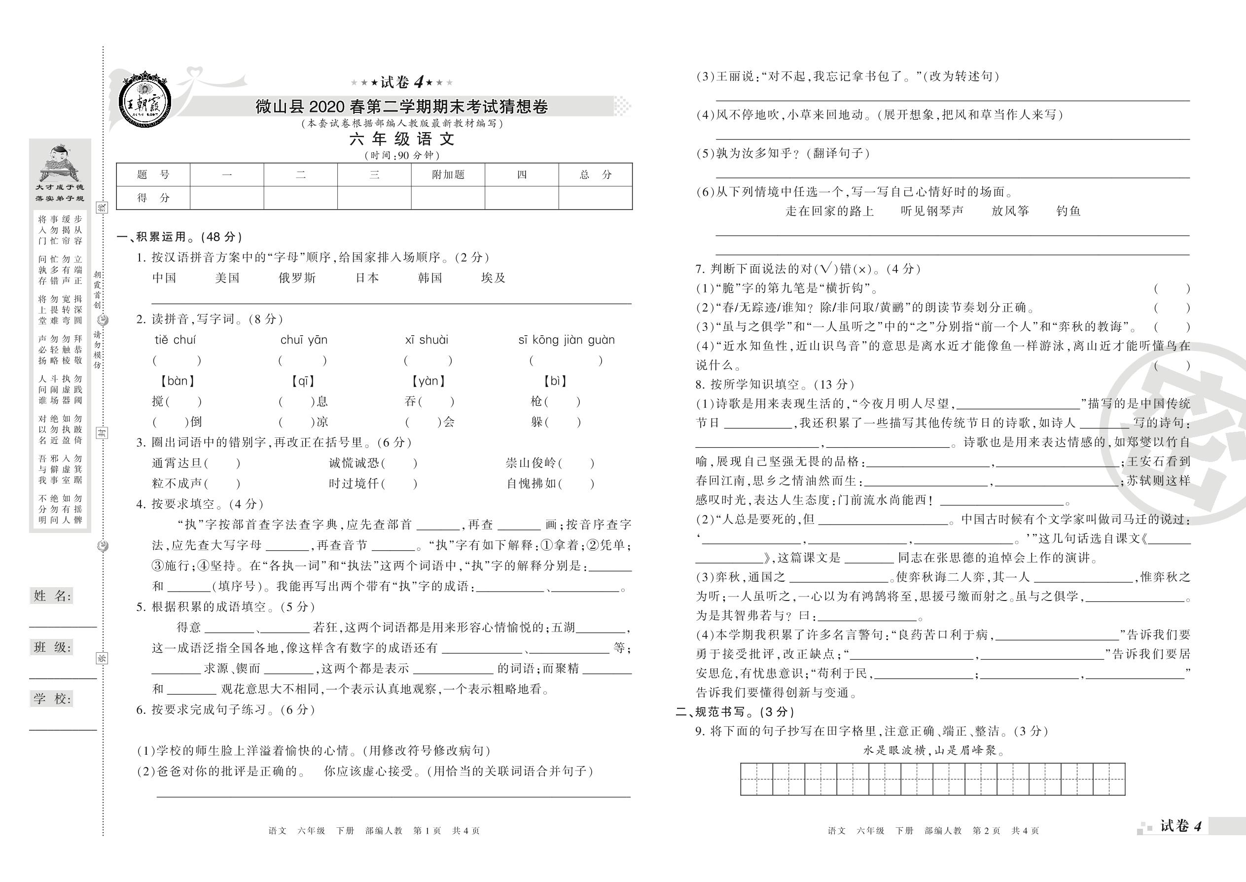 2018-2019学年第二学期济宁市微山县猜想卷六年级语文试卷(人教版)【4】