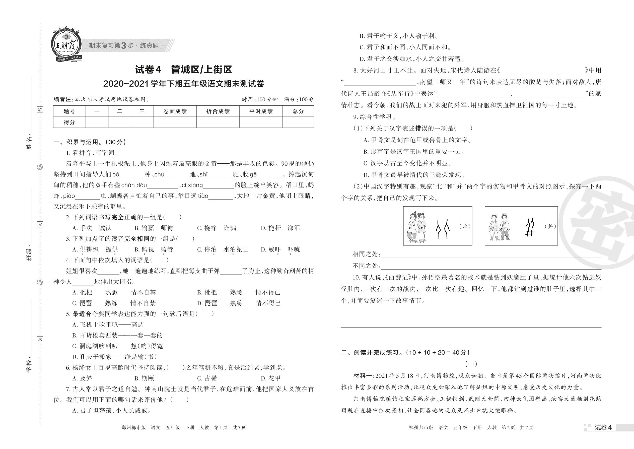 管城区、上街区2020~2021学年下期五年级语文期末测试卷(人教版)【4】
