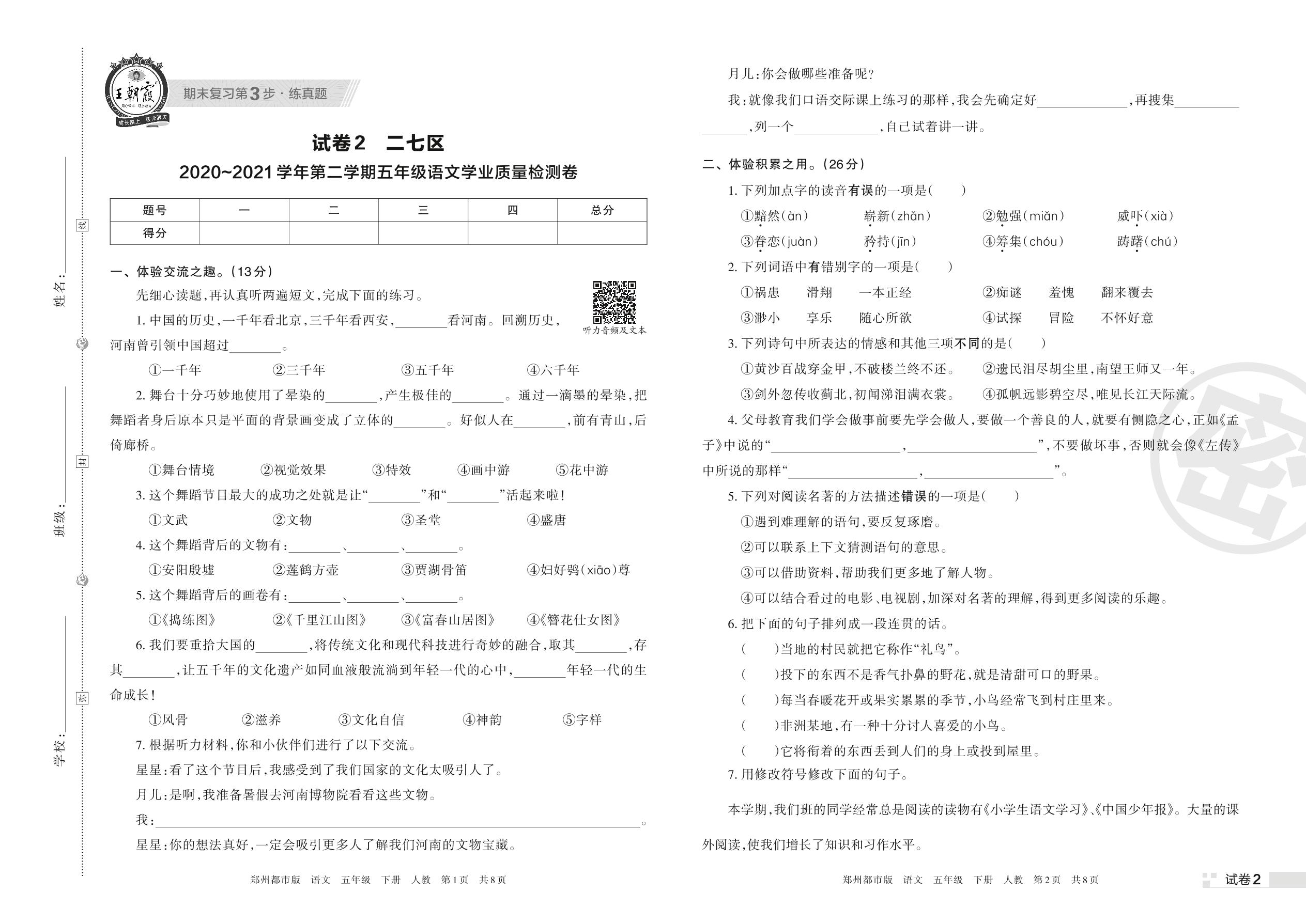 二七区2020~2021学年第二学期五年级语文学业质量检测卷(人教版)【2】