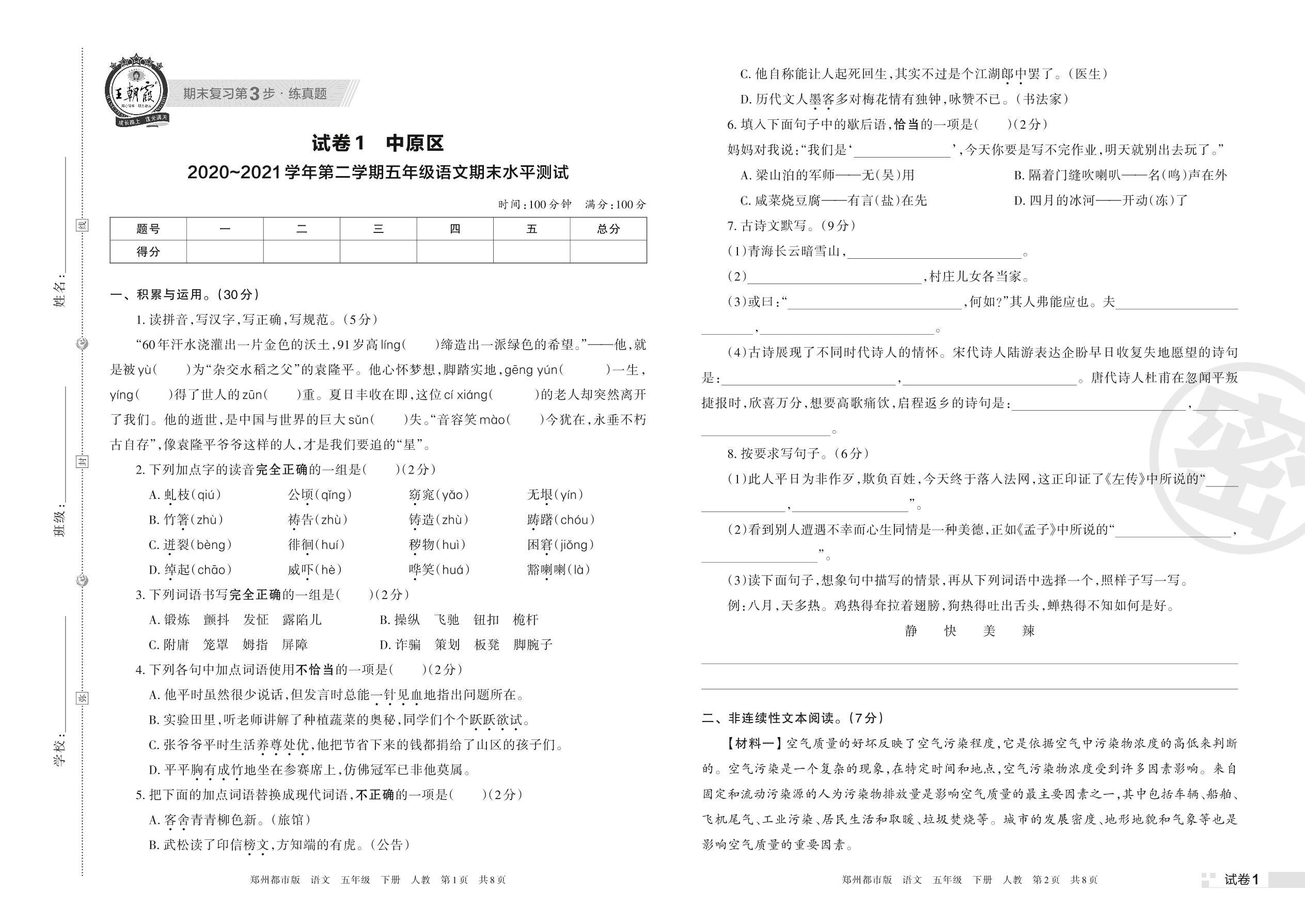 中原区2020~2021学年第二学期五年级语文期末水平测试(人教版)【1】