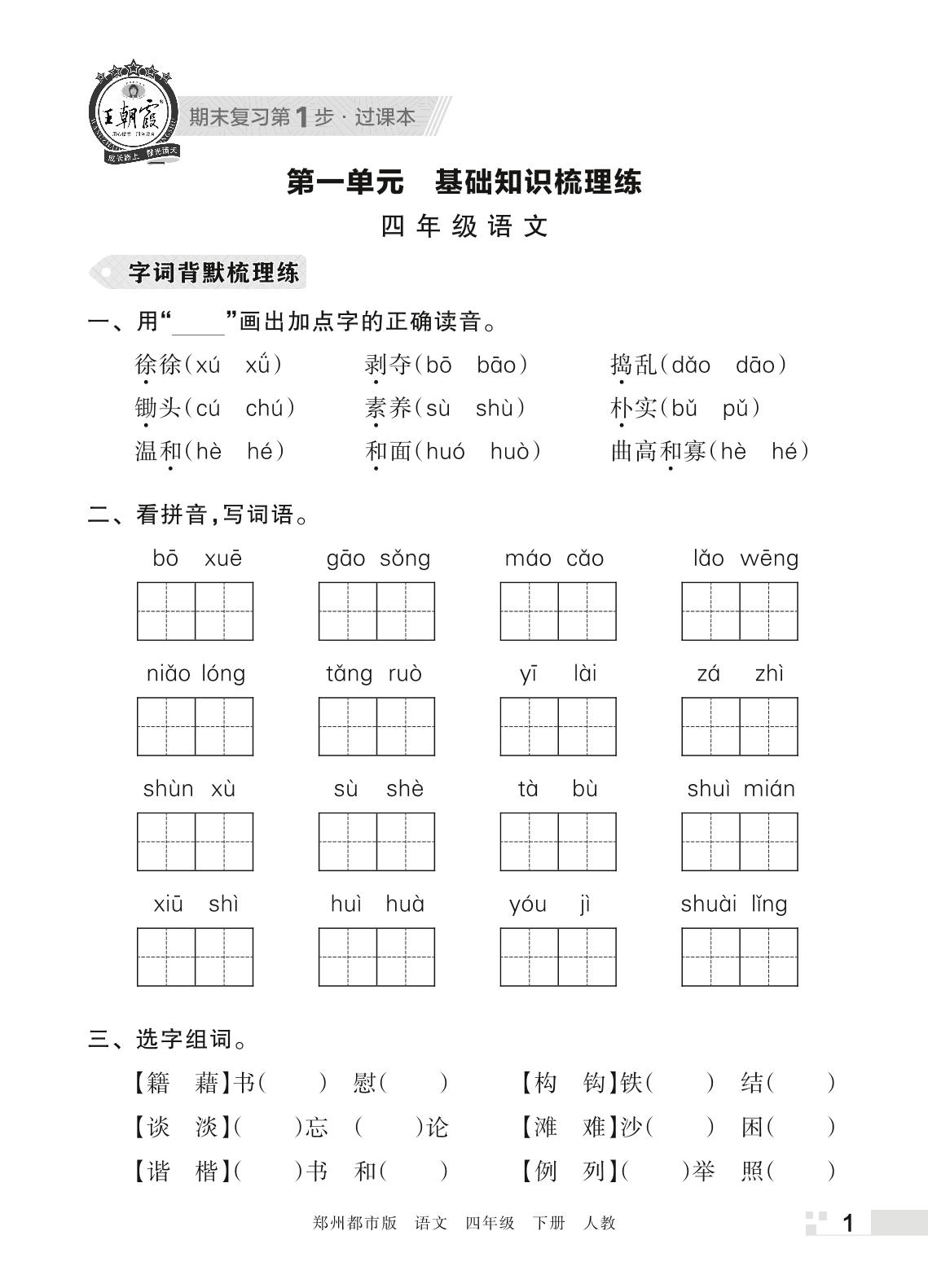 王朝霞期末过课本——第一单元 基础知识梳理练四年级下册语文(人教版)_R220331144328771