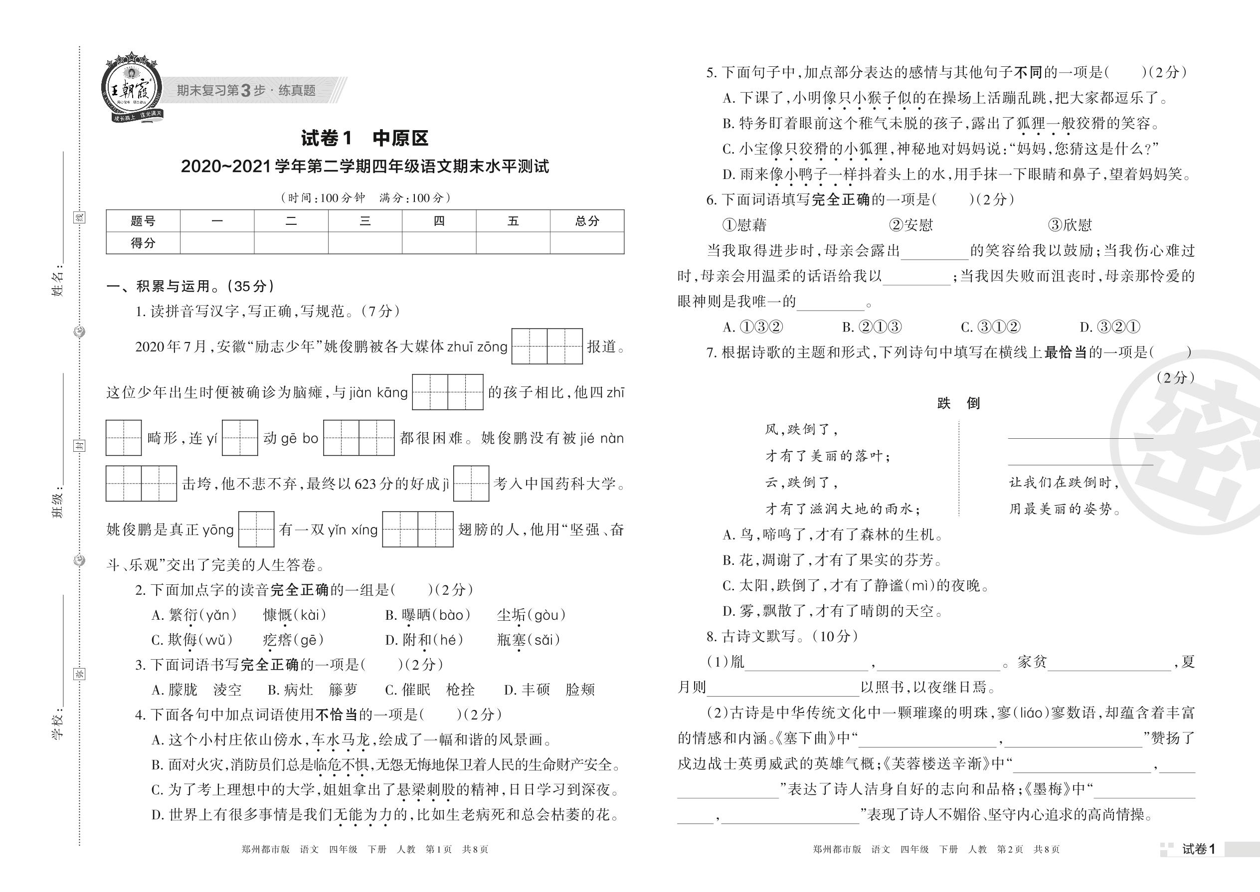 中原区2020~2021学年第二学期四年级语文期末水平测试(人教版)【1】