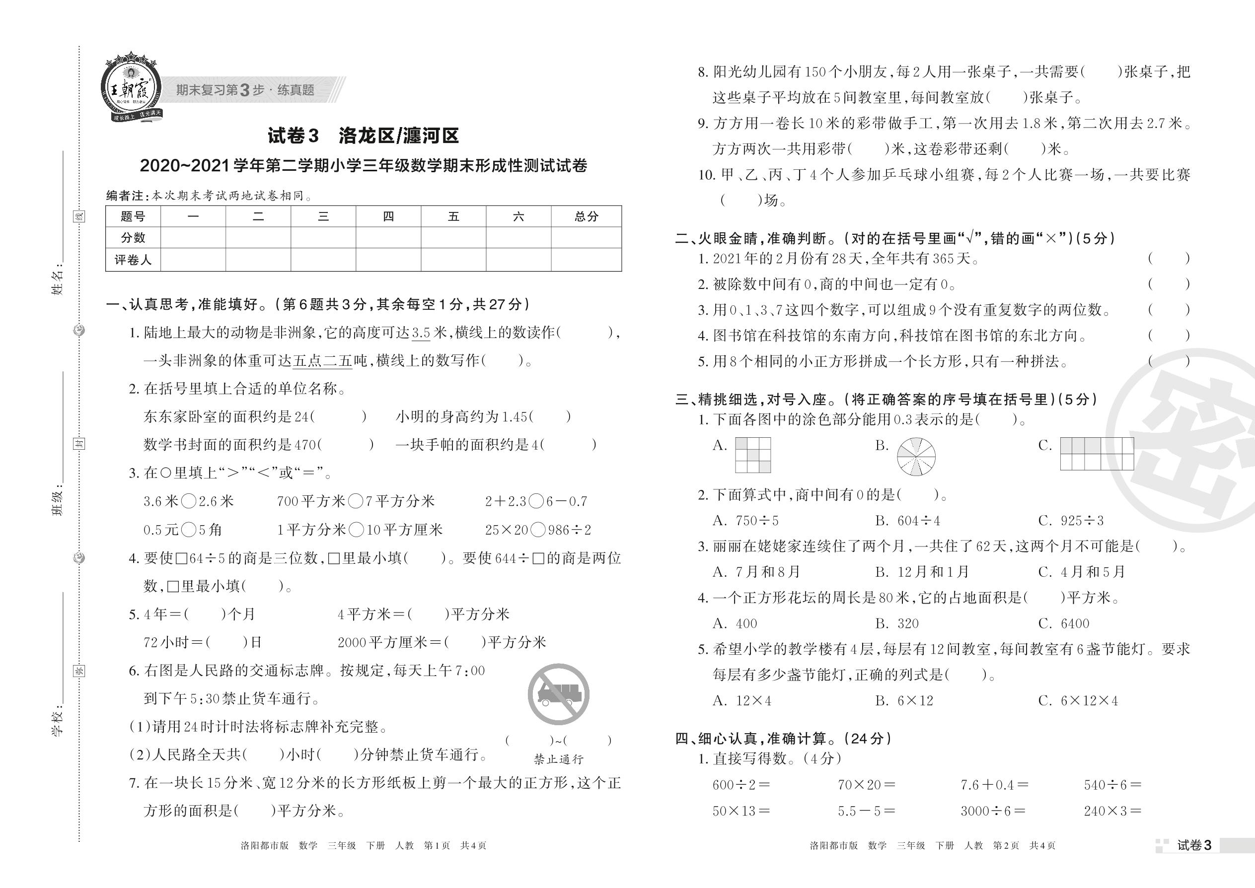洛龙区、瀍河区2020~2021学年第二学期小学三年级数学期末形成性测试试卷(人教版)【3】