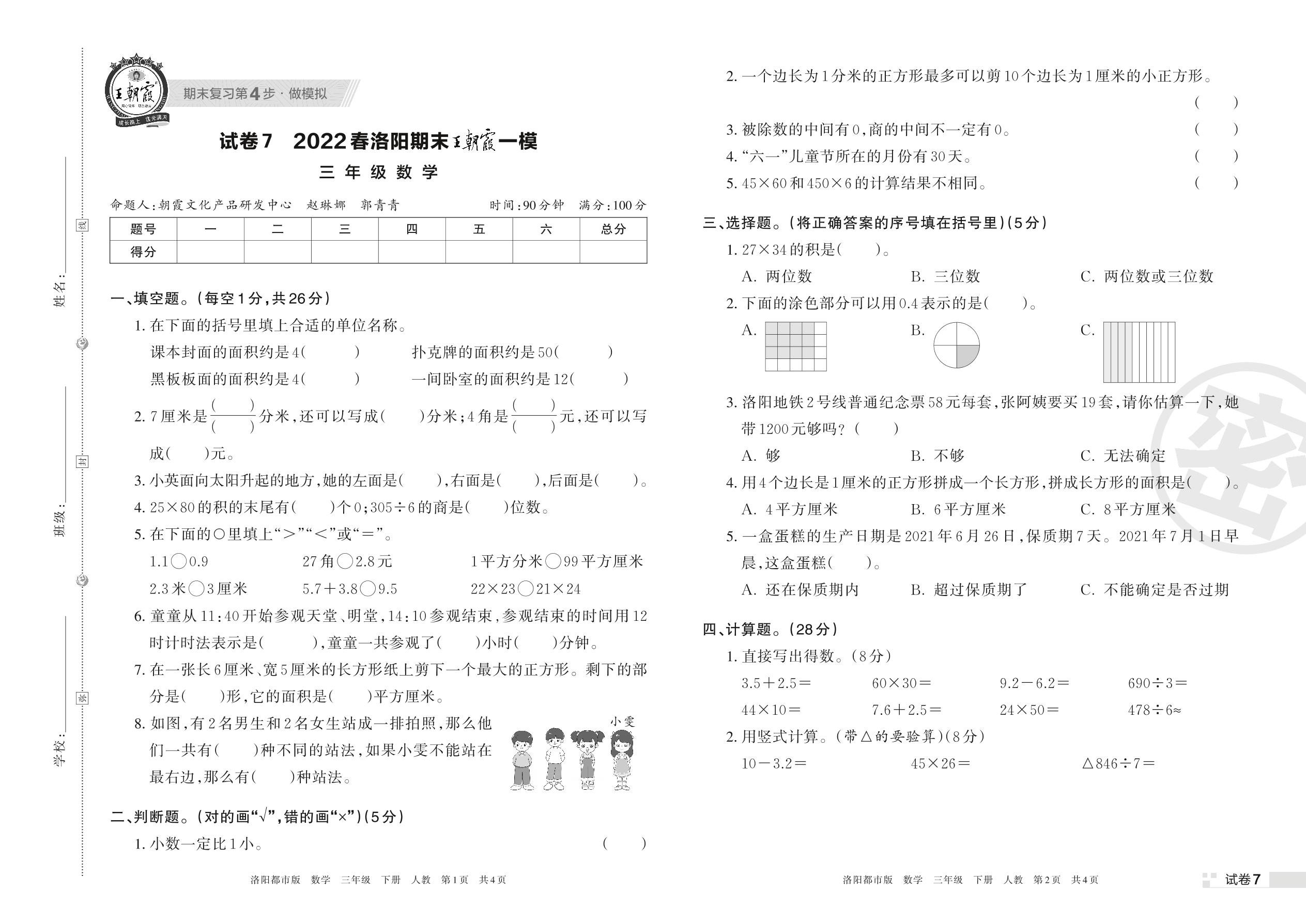 王朝霞期末模拟卷三年级下册数学(人教版)_R220331144834149【7】