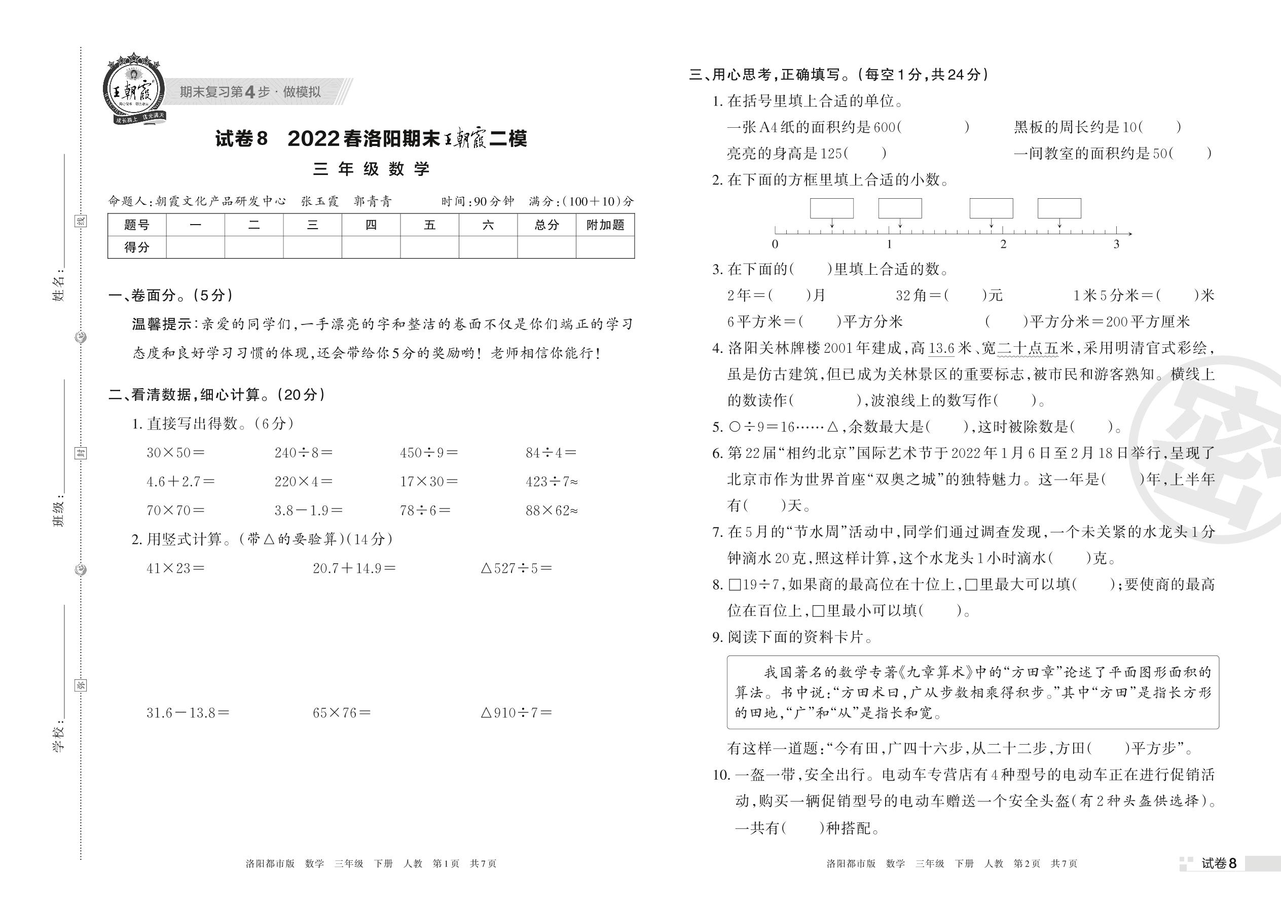 王朝霞期末模拟卷三年级下册数学(人教版)_R220331144834381【8】