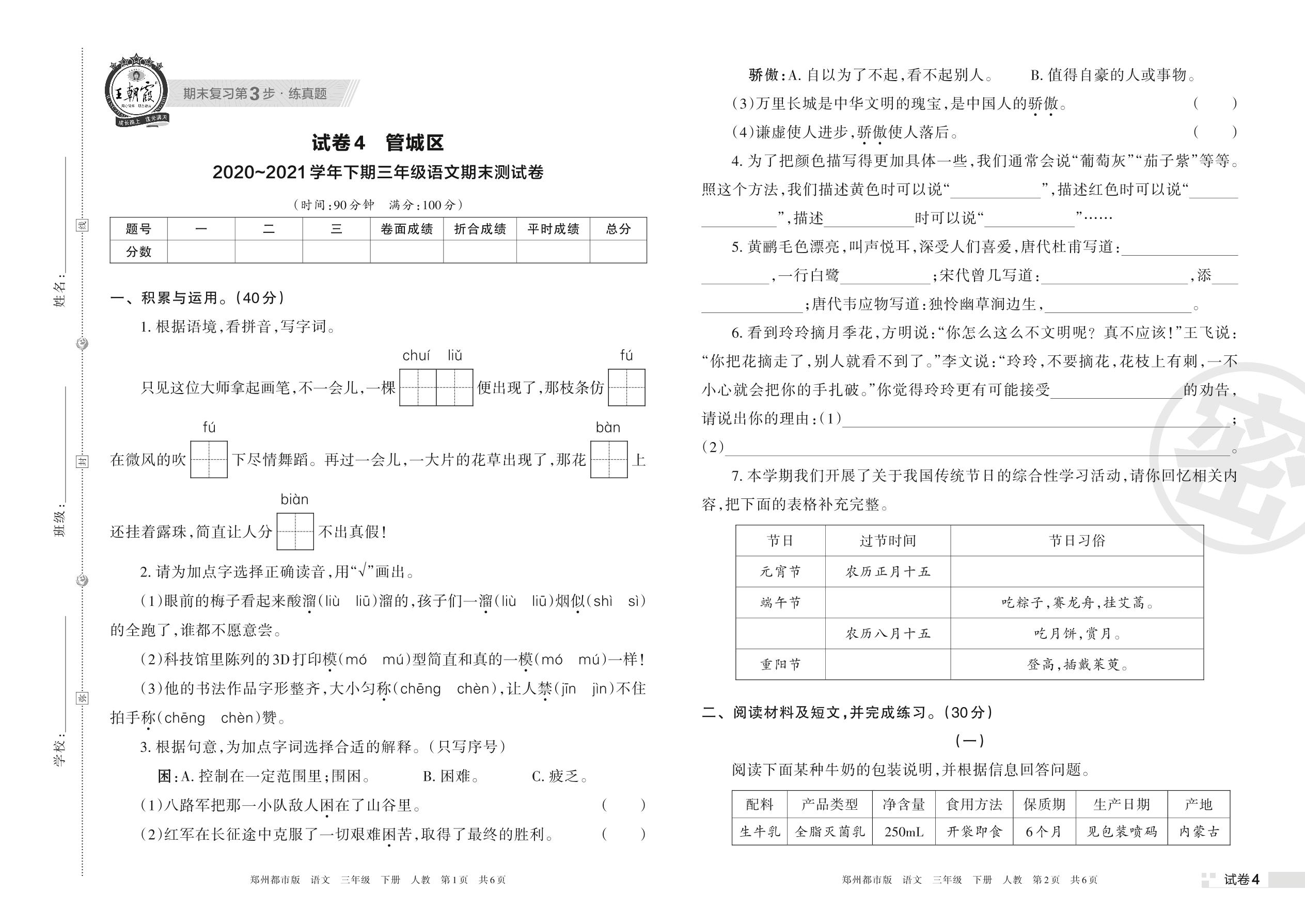 三年级语文人教版下册期末卷
