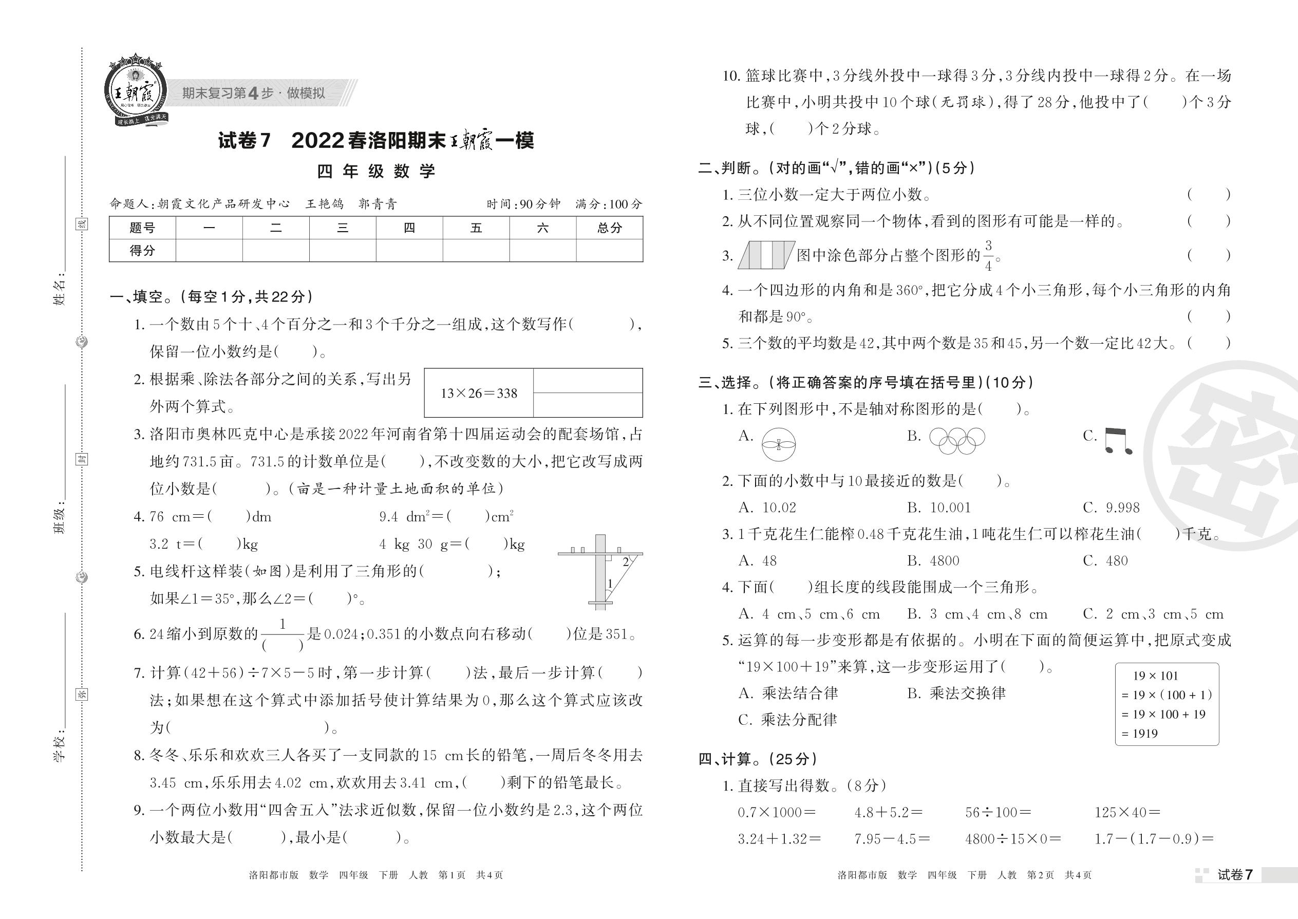 王朝霞期末模拟卷四年级下册数学(人教版)_R220331150317376【7】