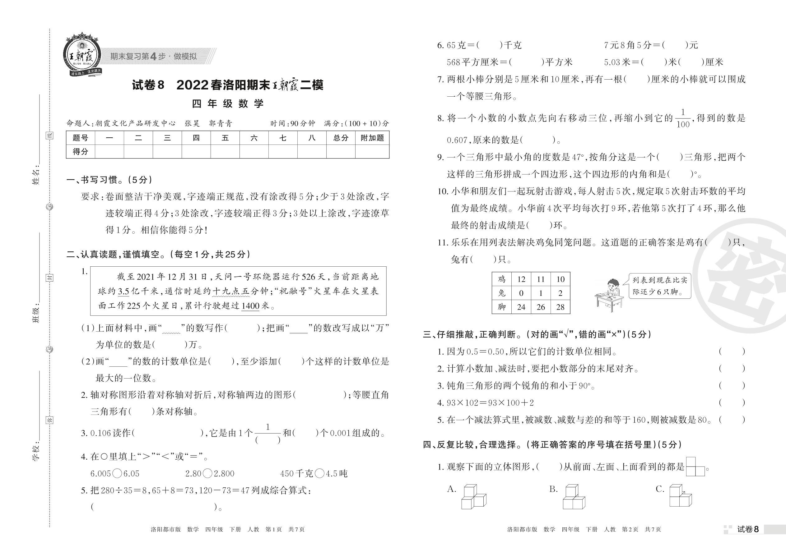 王朝霞期末模拟卷四年级下册数学(人教版)_R220331150317703【8】