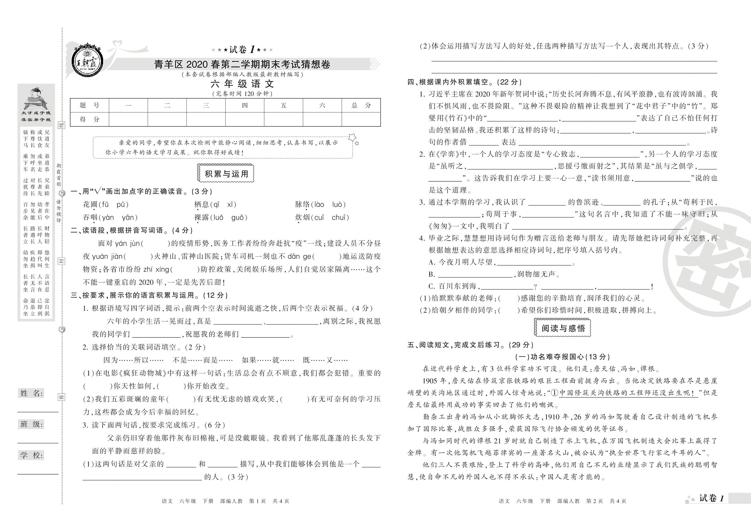 2018-2019学年第二学期成都市青羊区六年级语文试卷(人教版)【1】