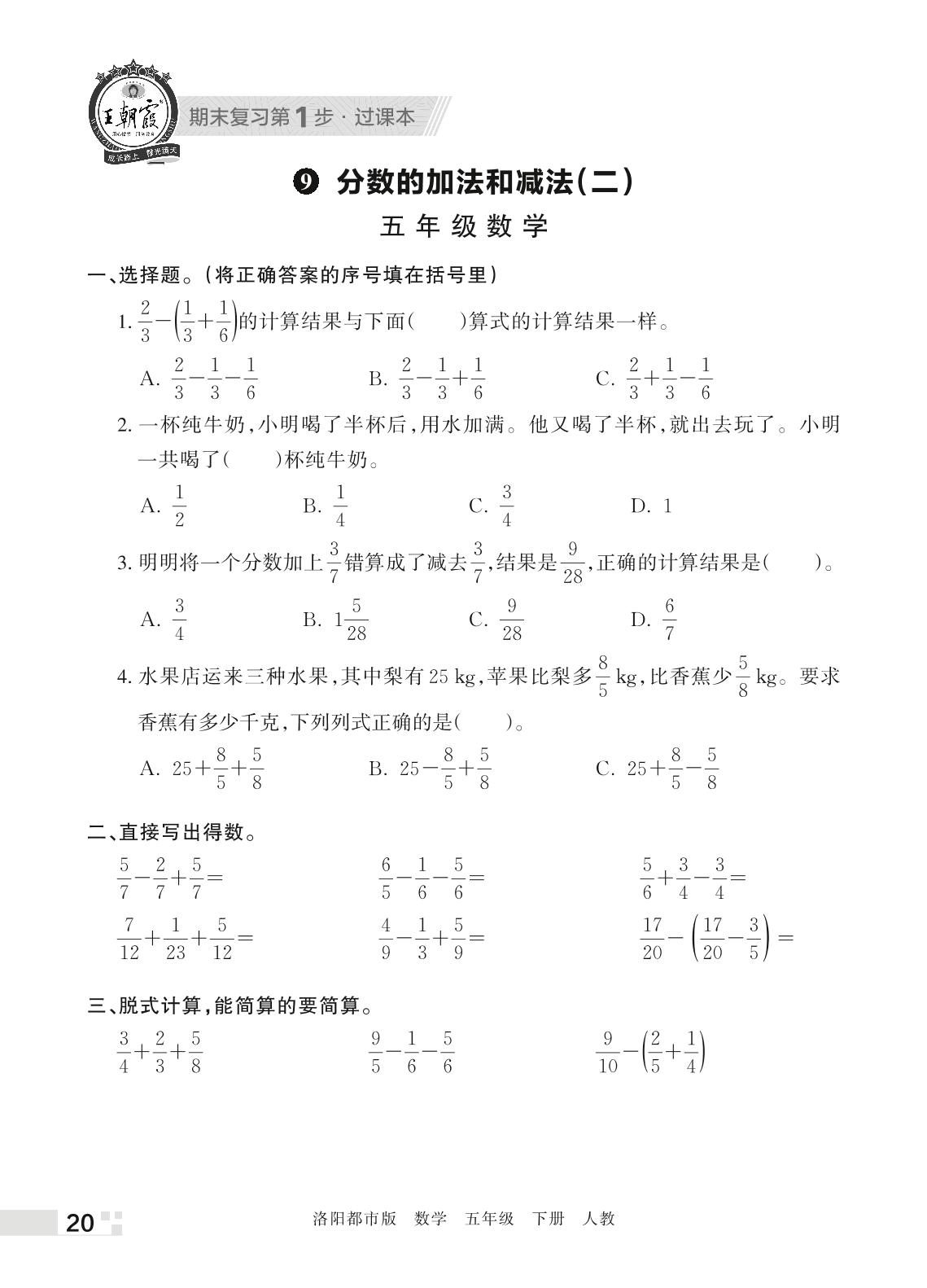 王朝霞期末过课本——9 分数的加法和减法(二)五年级下册数学(人教版)_R220331151225613
