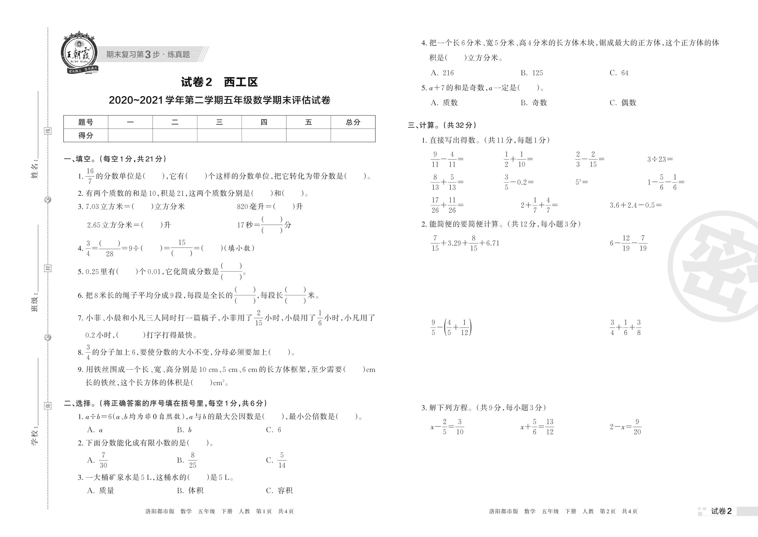 西工区2020~2021学年第二学期五年级数学期末评估试卷(人教版)【2】