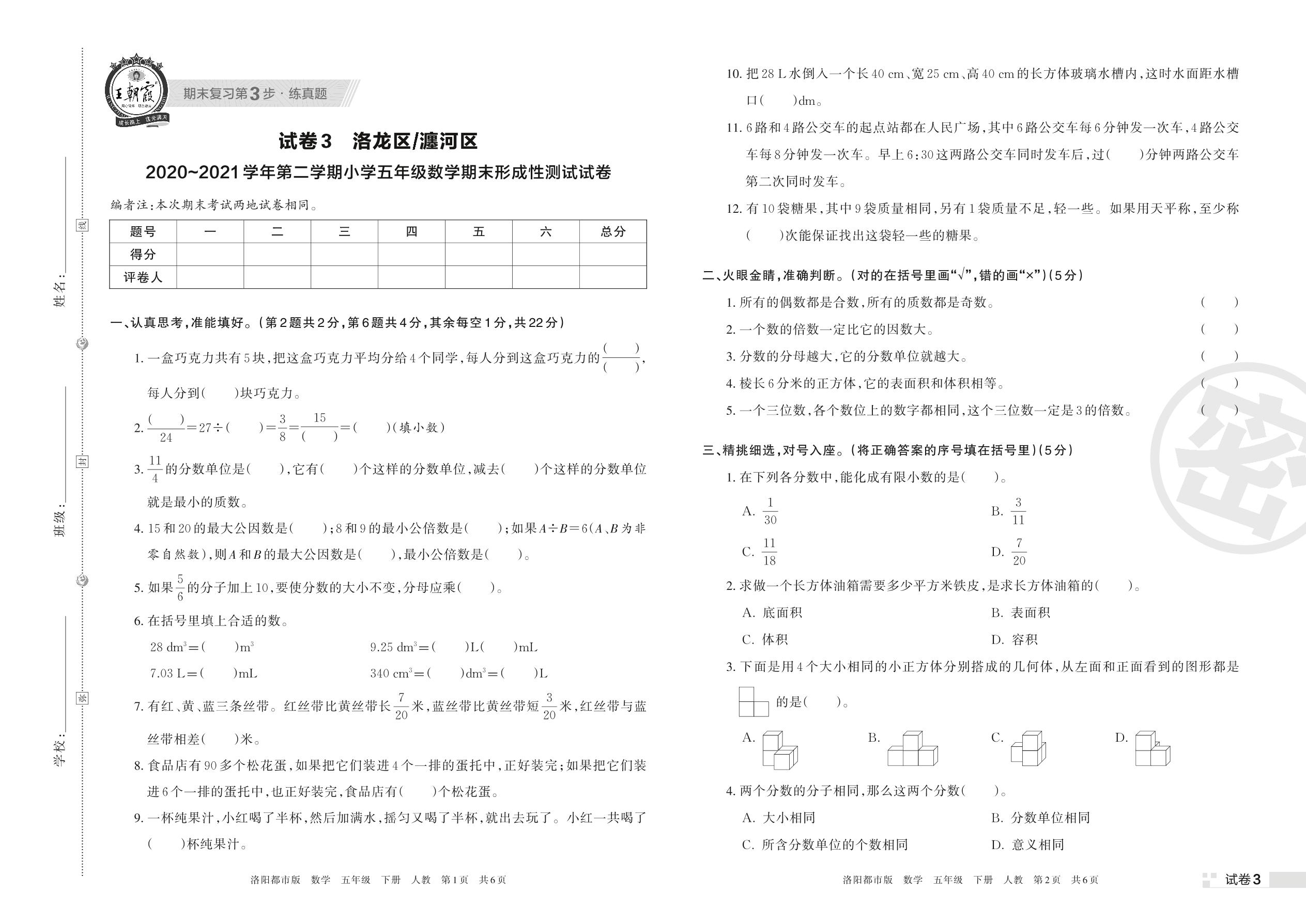 洛龙区、瀍河区2020~2021学年第二学期小学五年级数学期末形成性测试试卷(人教版)【3】