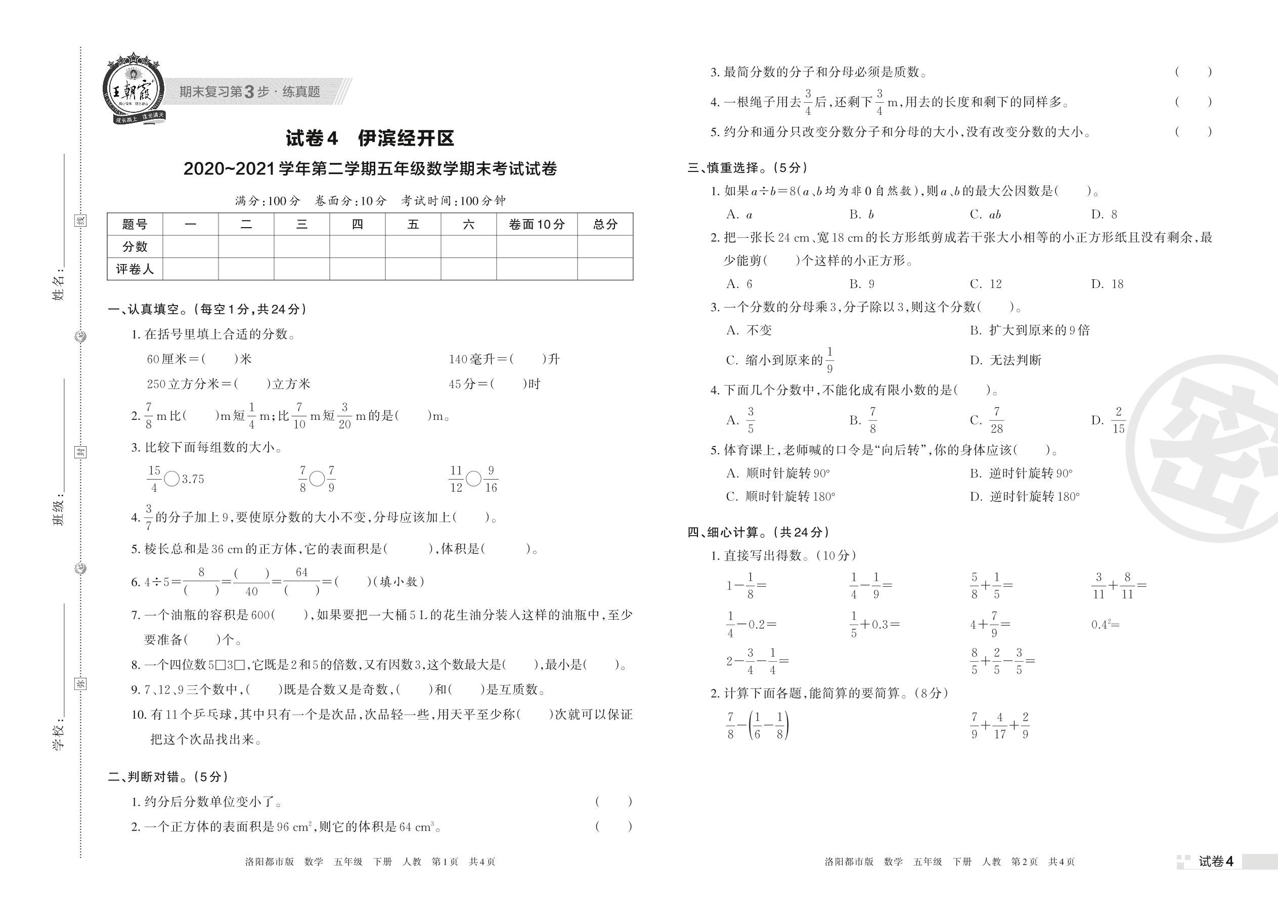 伊滨经开区2020~2021学年第二学期五年级数学期末考试试卷(人教版)【4】
