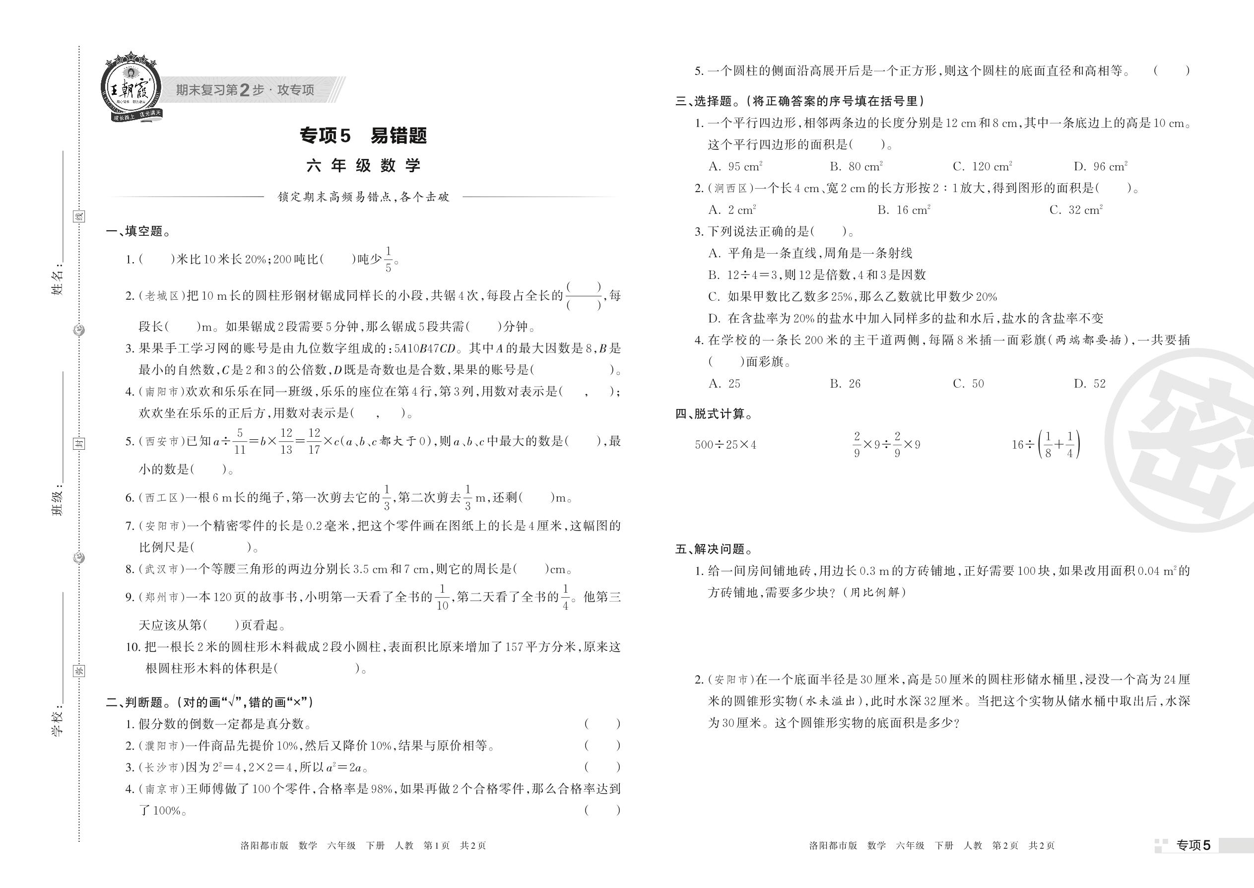 王朝霞期末专项卷——易错题六年级下册数学(人教版)_R220331151822052【5】