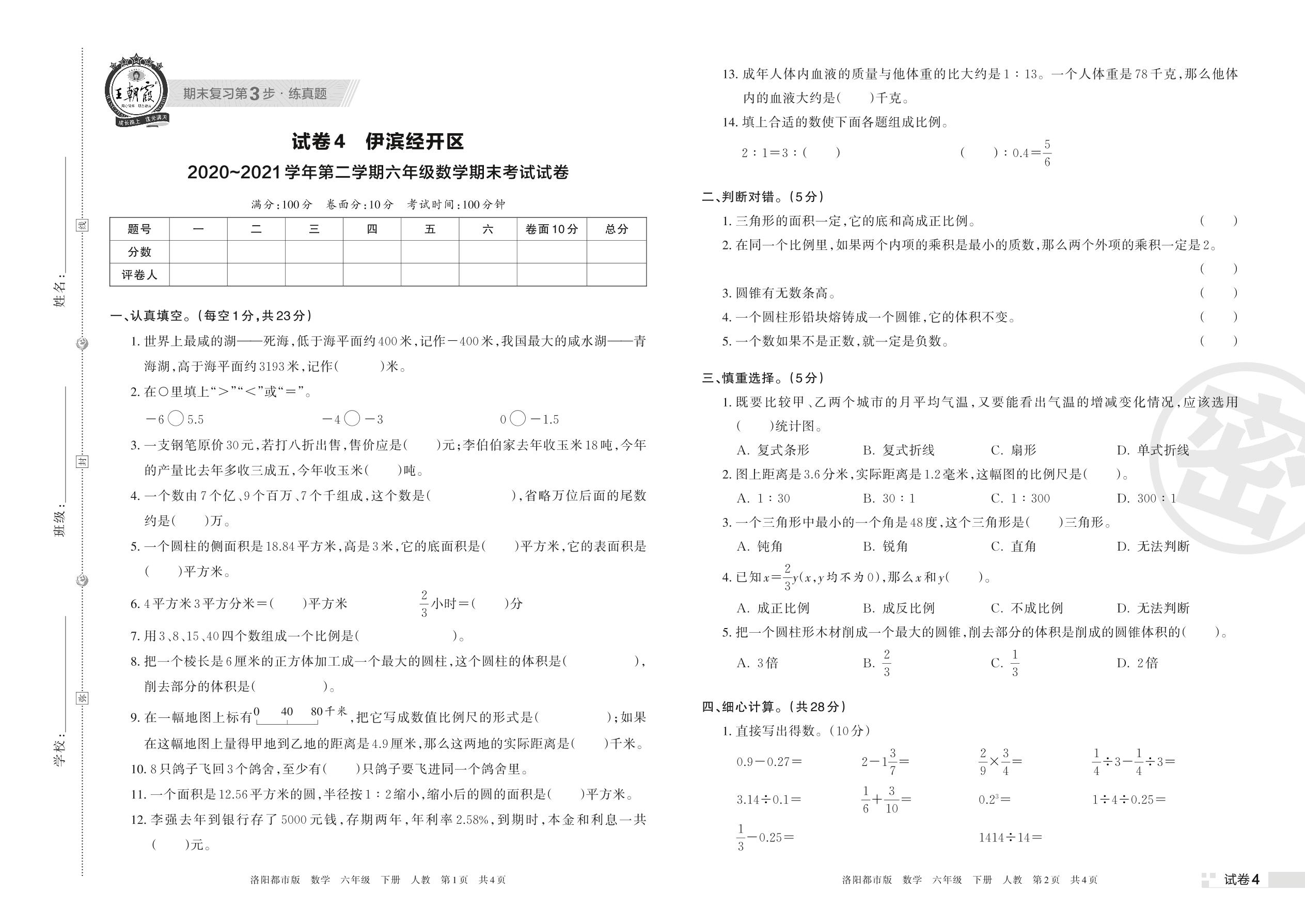 伊滨经开区2020~2021学年第二学期六年级数学期末考试试卷(人教版)【4】