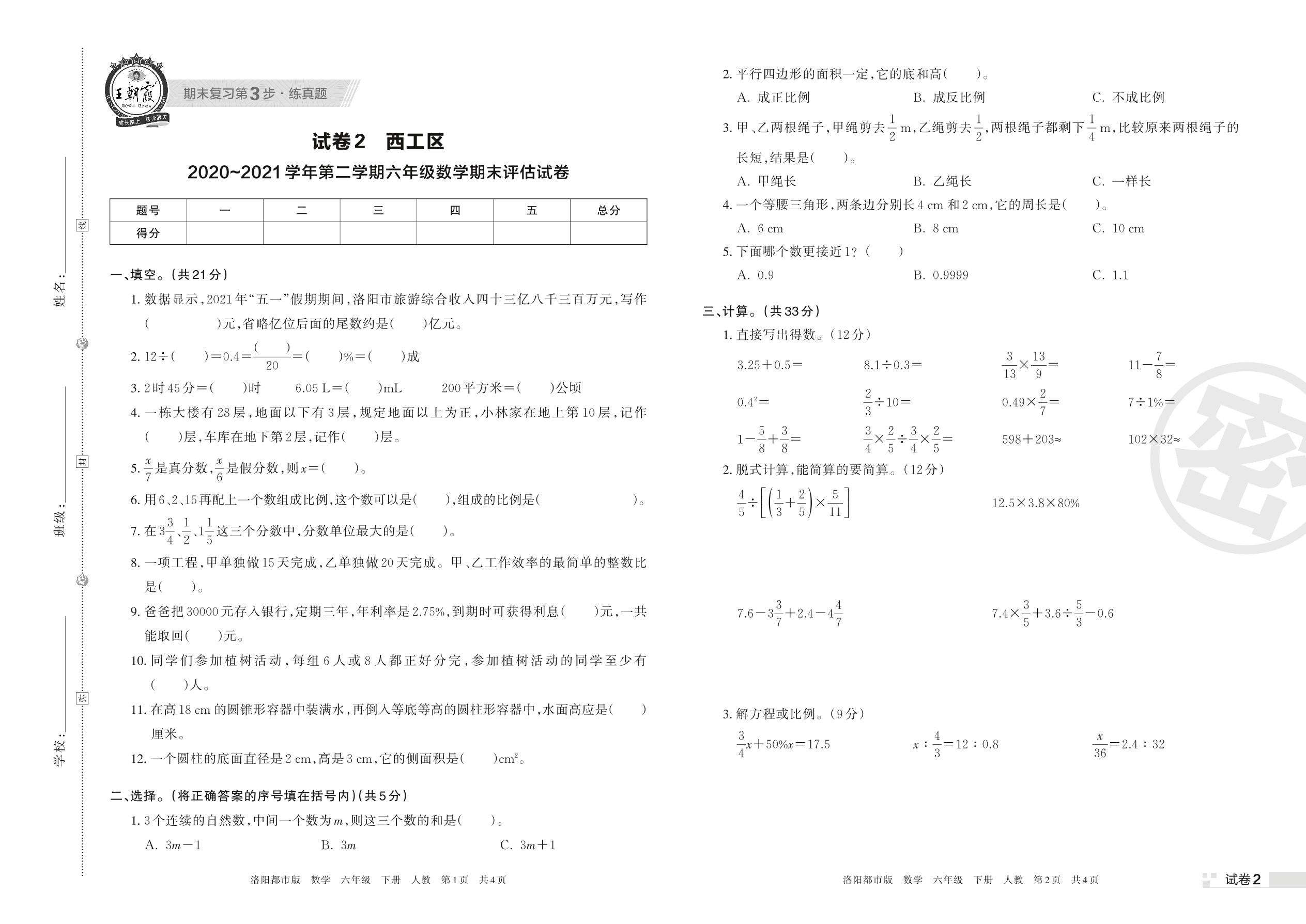 西工区2020~2021学年第二学期六年级数学期末评估试卷(人教版)【2】