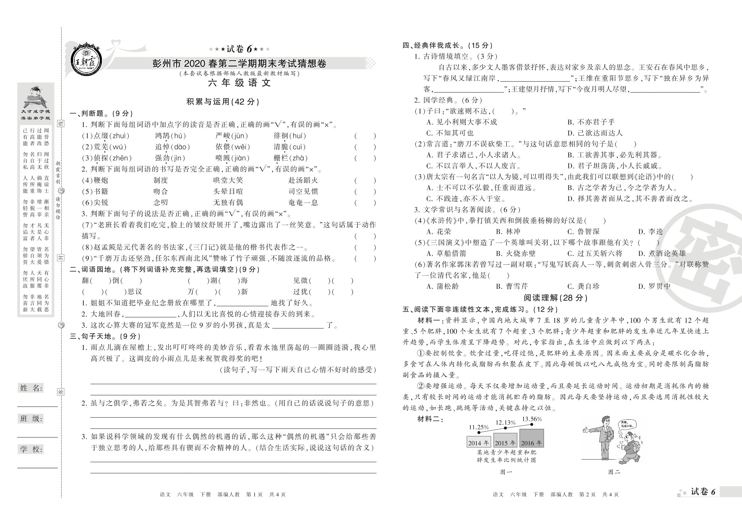 2018-2019学年第二学期彭州市六年级语文试卷(人教版)【6】