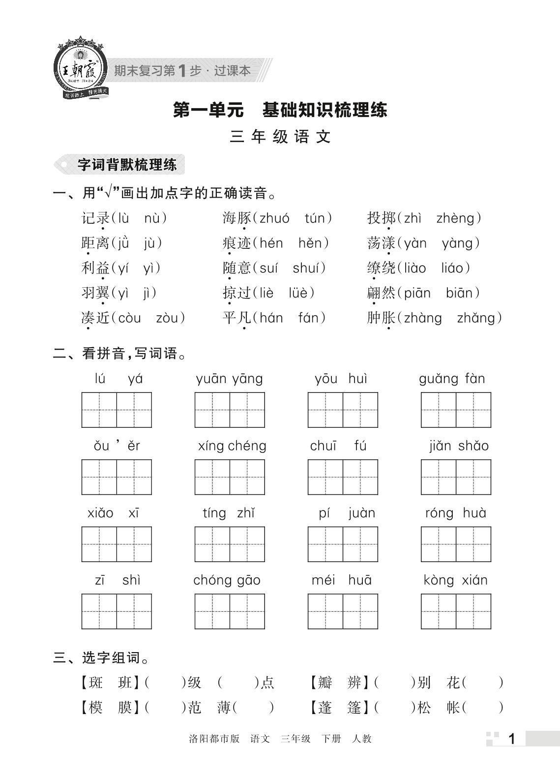 王朝霞期末过课本——第一单元 基础知识梳理练三年级下册语文(人教版)_R220331152429737