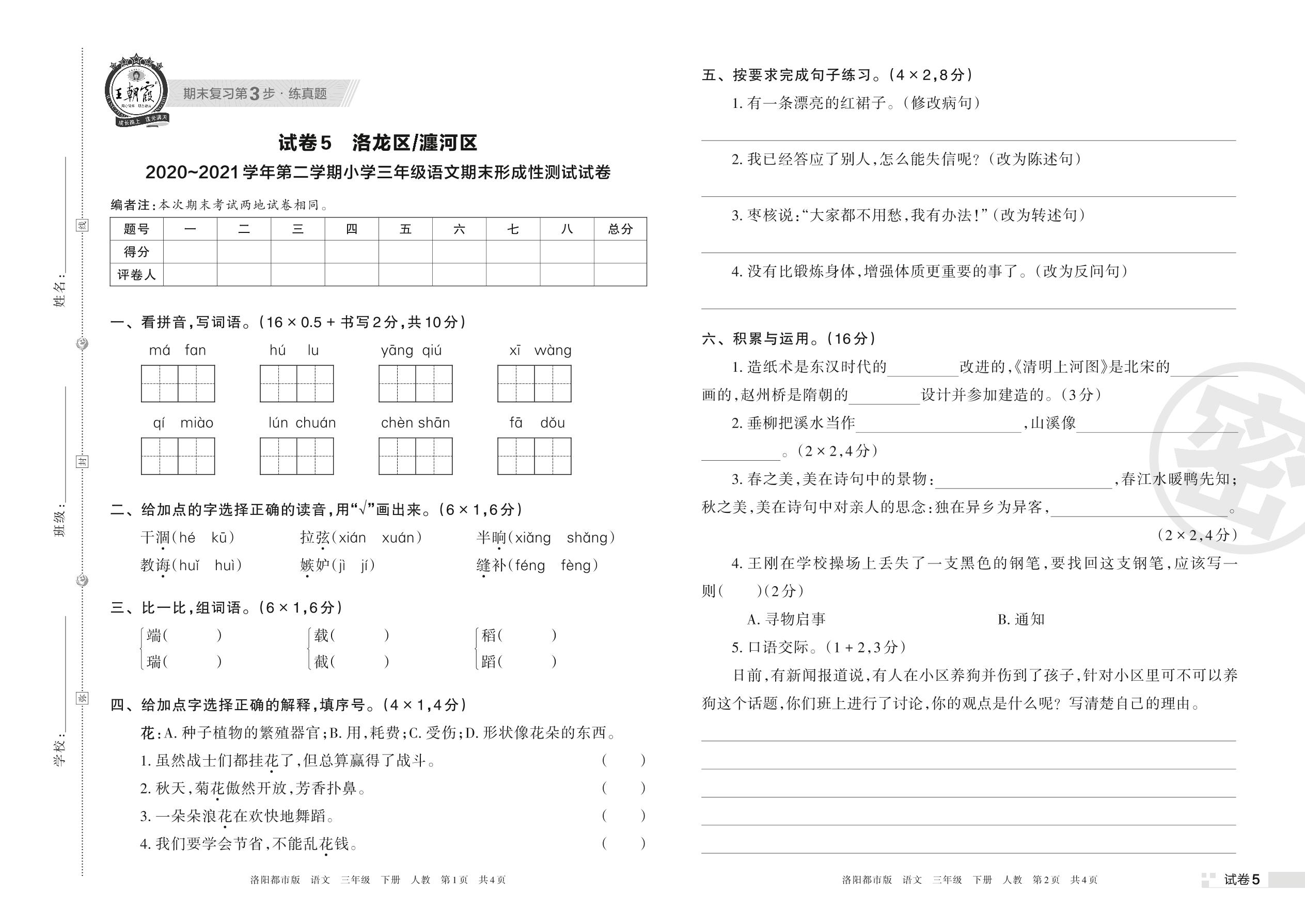 洛龙区、瀍河区2020~2021学年第二学期小学三年级语文期末形成性测试试卷(人教版)【5】