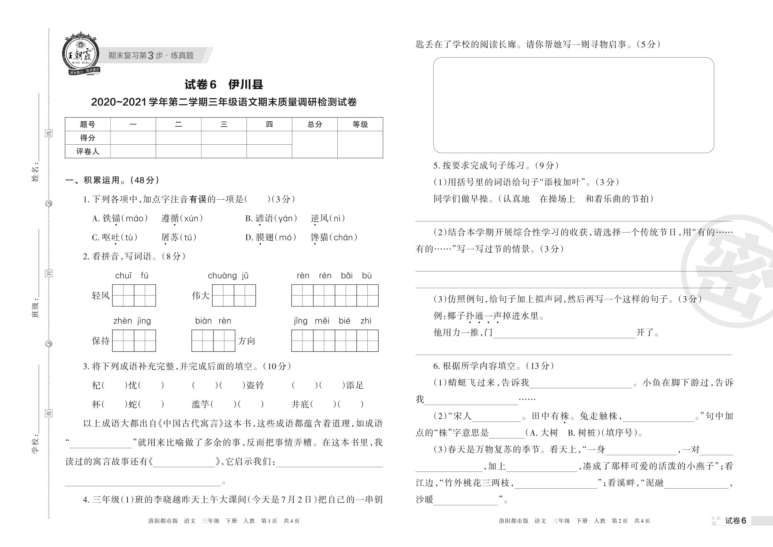 伊川县2020~2021学年第二学期三年级语文期末质量调研检测试卷(人教版)【6】
