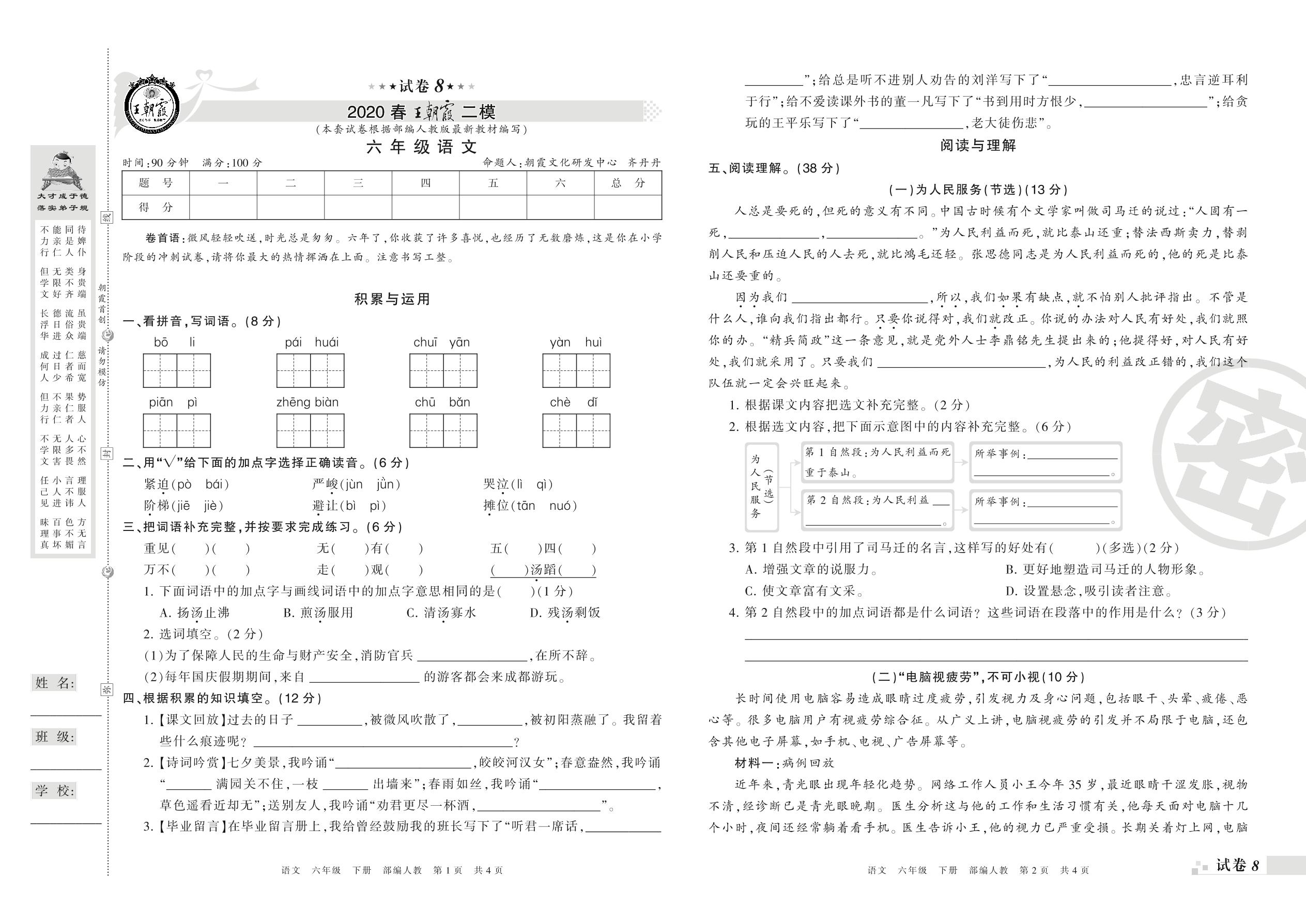 王朝霞期末模拟卷六年级下册语文(人教版)_R21080220618【8】