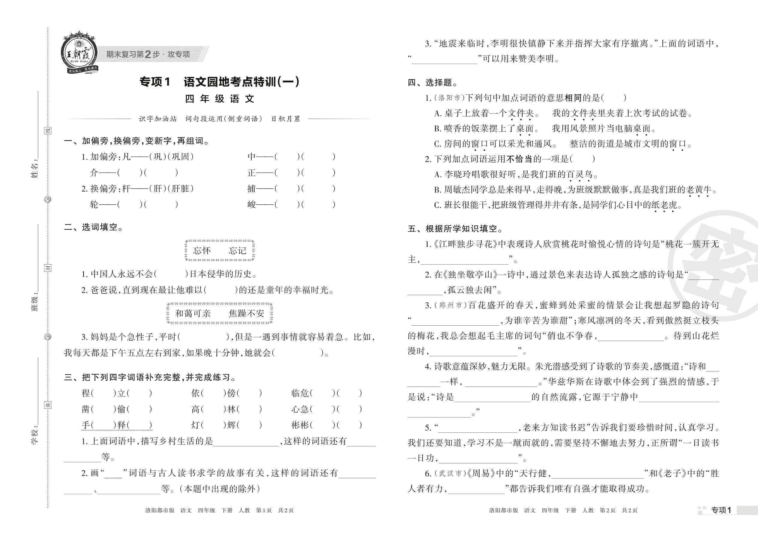 王朝霞期末专项卷——语文园地考点特训(一)四年级下册语文(人教版)_R220331153016621【1】