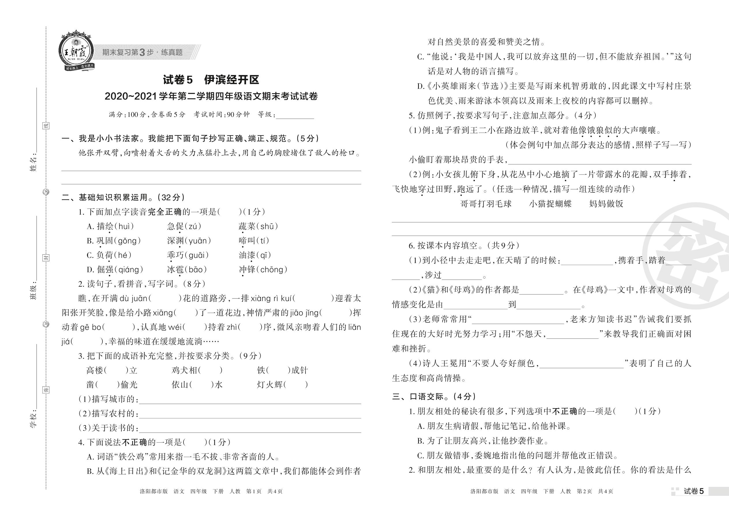 伊滨经开区2020~2021学年第二学期四年级语文期末考试试卷(人教版)【5】