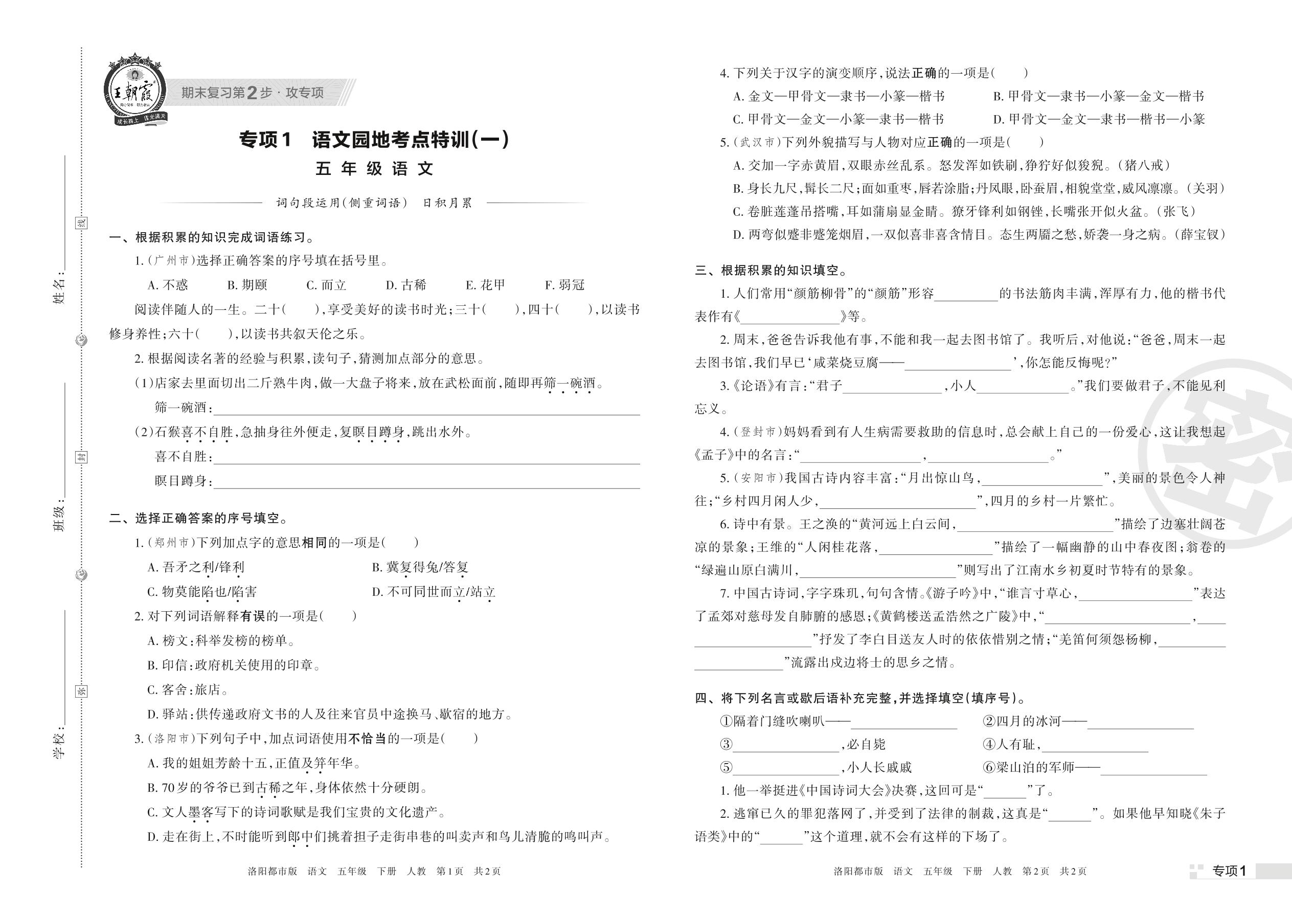 王朝霞期末专项卷——语文园地考点特训(一)五年级下册语文(人教版)_R220331153556294【1】