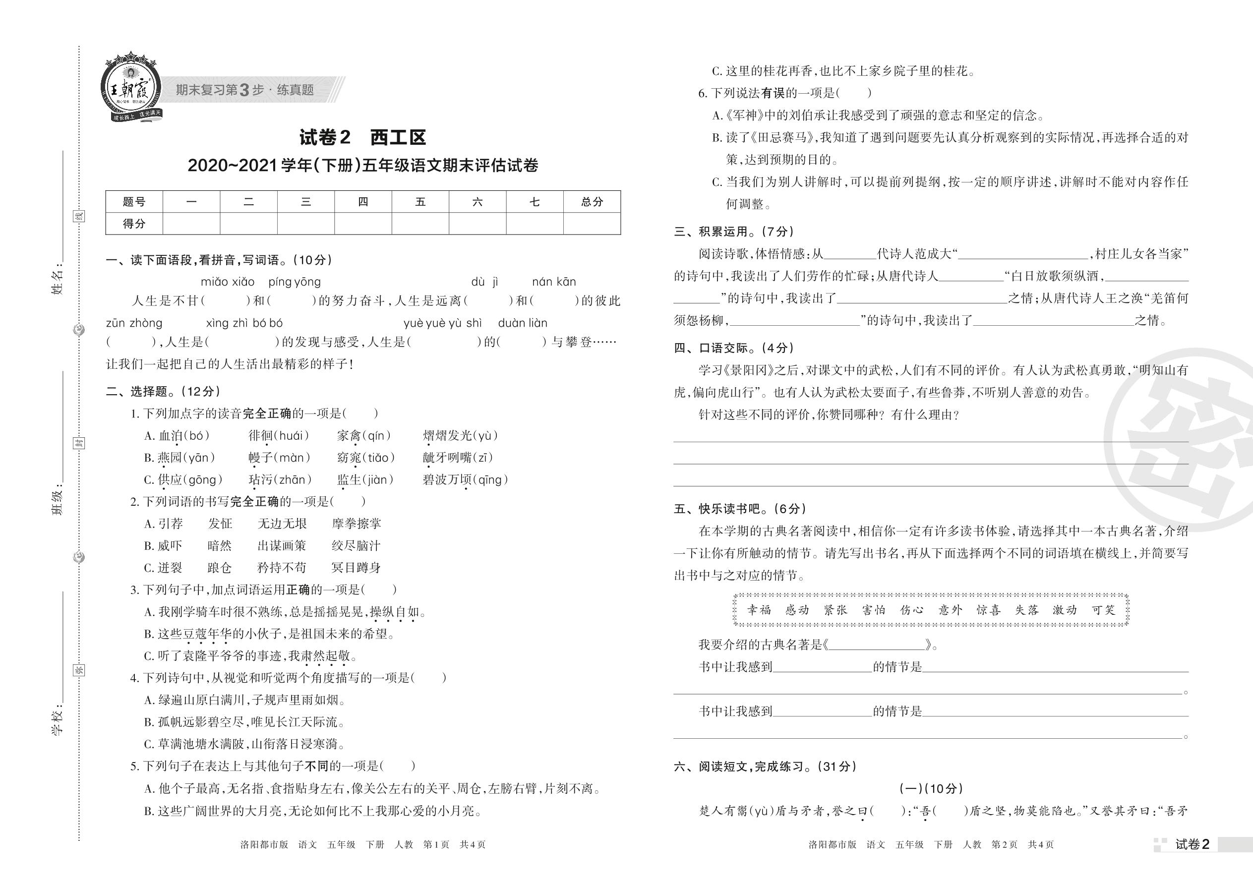 西工区2020~2021学年(下册)五年级语文期末评估试卷(人教版)【2】