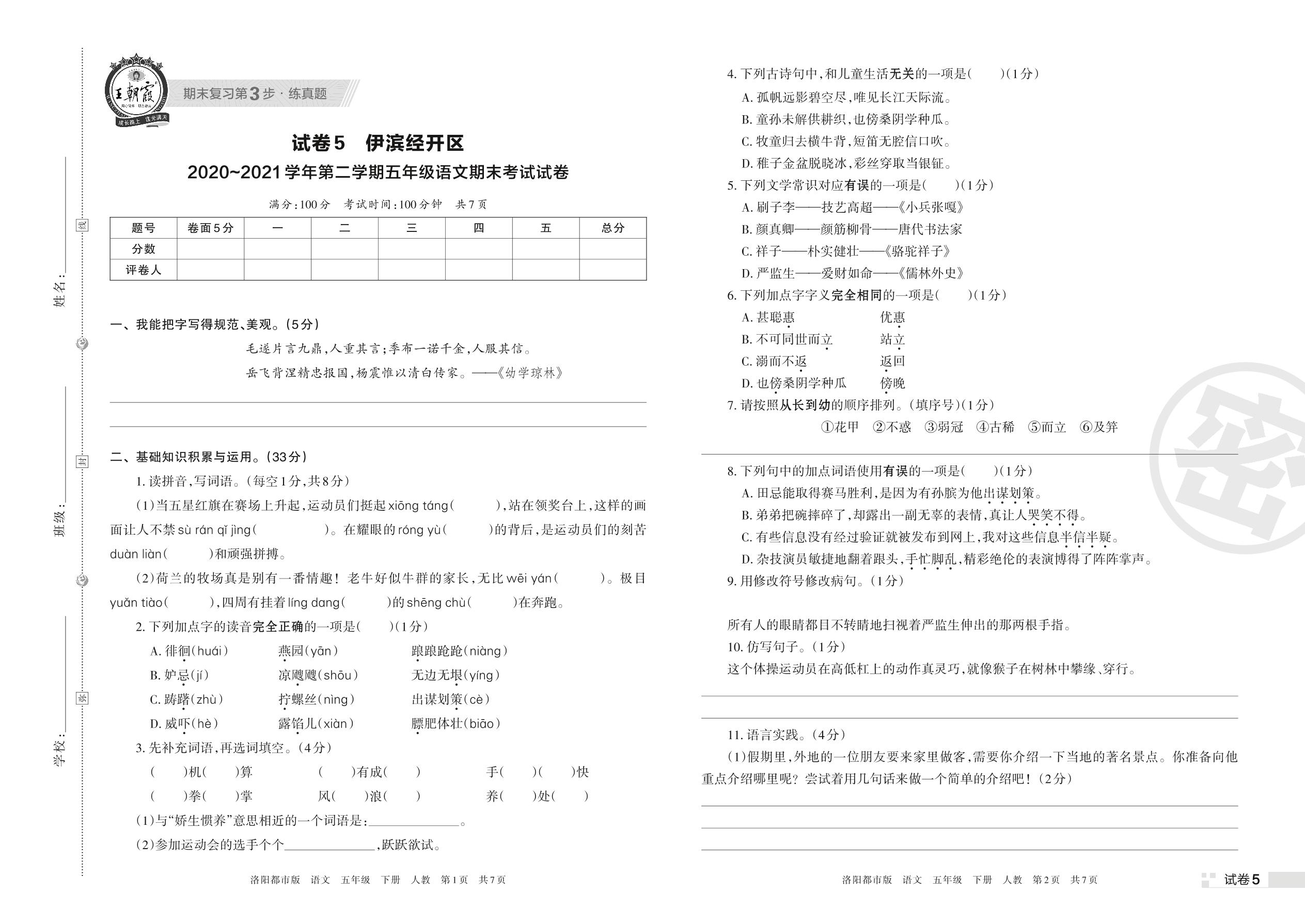 五年级语文人教版下册期末卷
