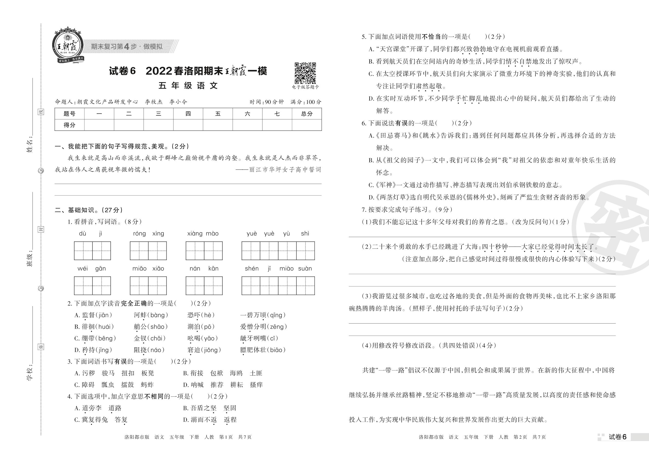 王朝霞期末模拟卷五年级下册语文(人教版)_R220331153557661【6】