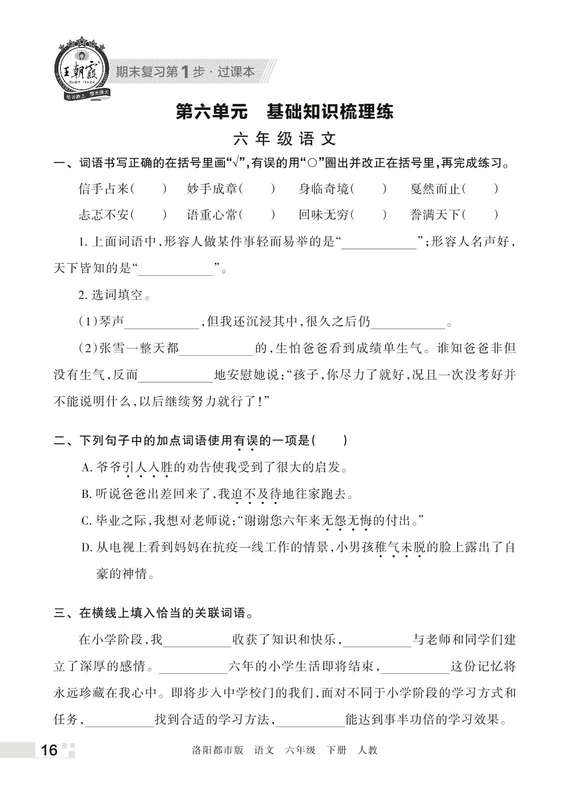 王朝霞期末过课本——第六单元 基础知识梳理练六年级下册语文(人教版)_R220331154200353