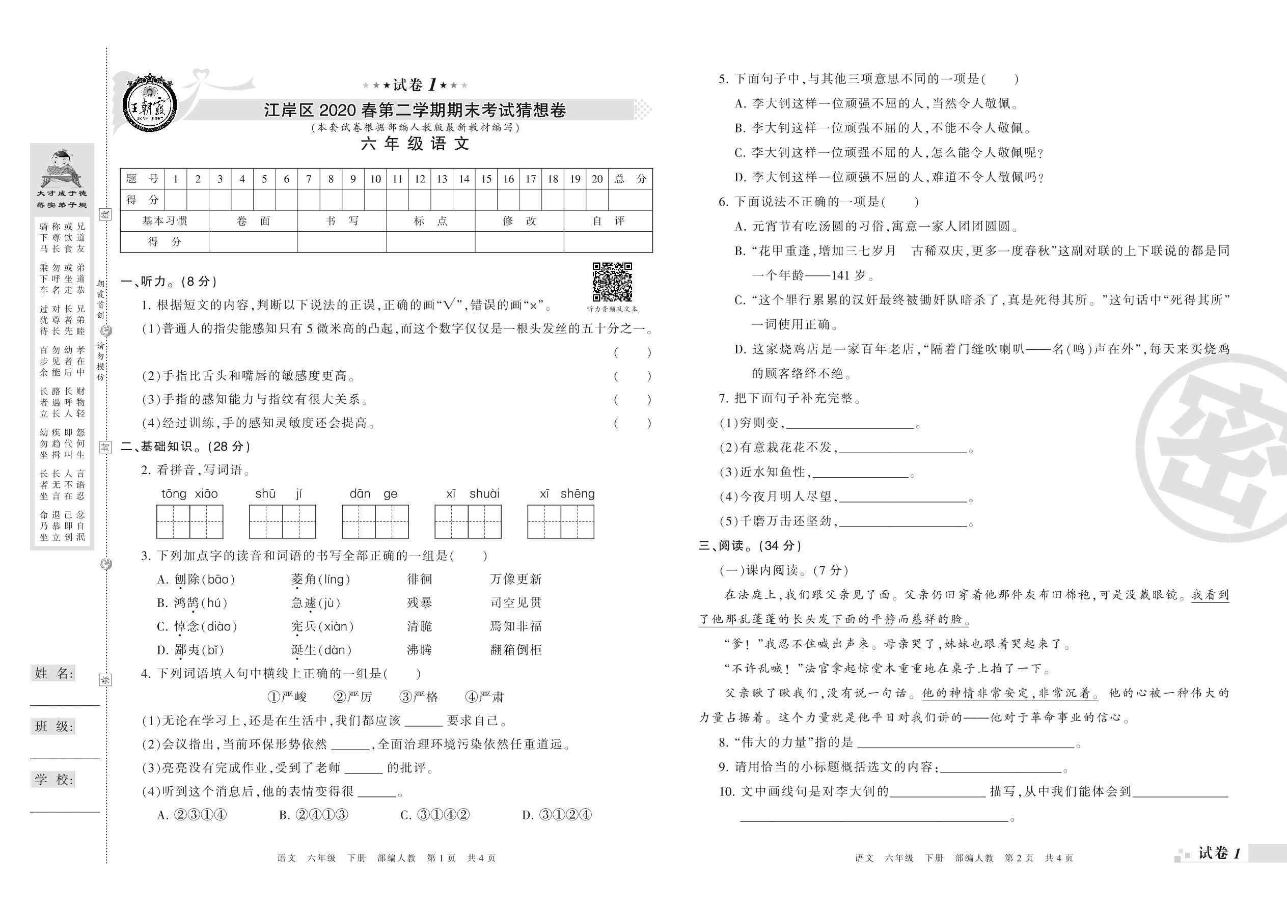 2018-2019学年第二学期武汉市江岸区猜想卷六年级语文试卷(人教版)【1】