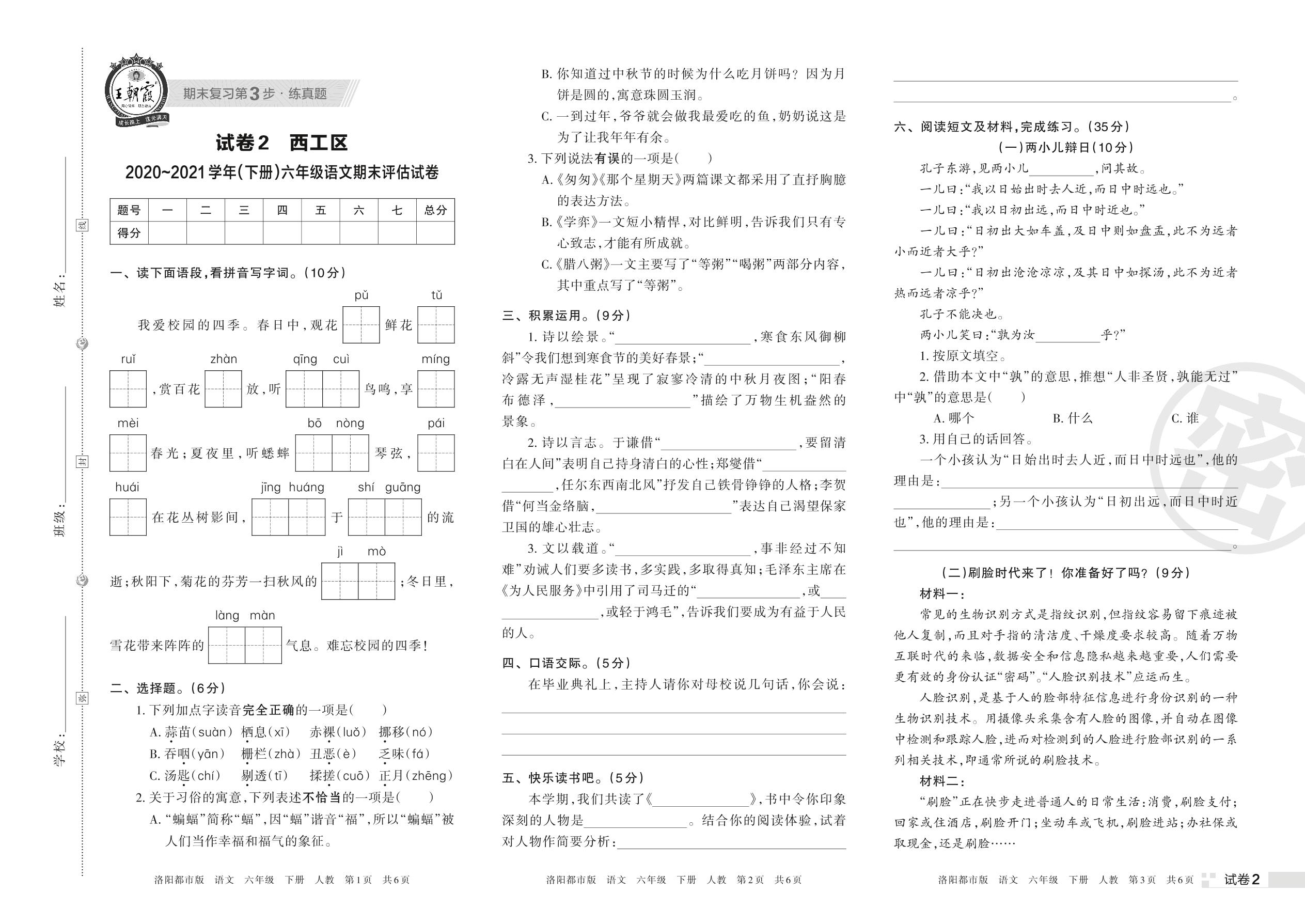 西工区2020~2021学年(下册)六年级语文期末评估试卷(人教版)【2】