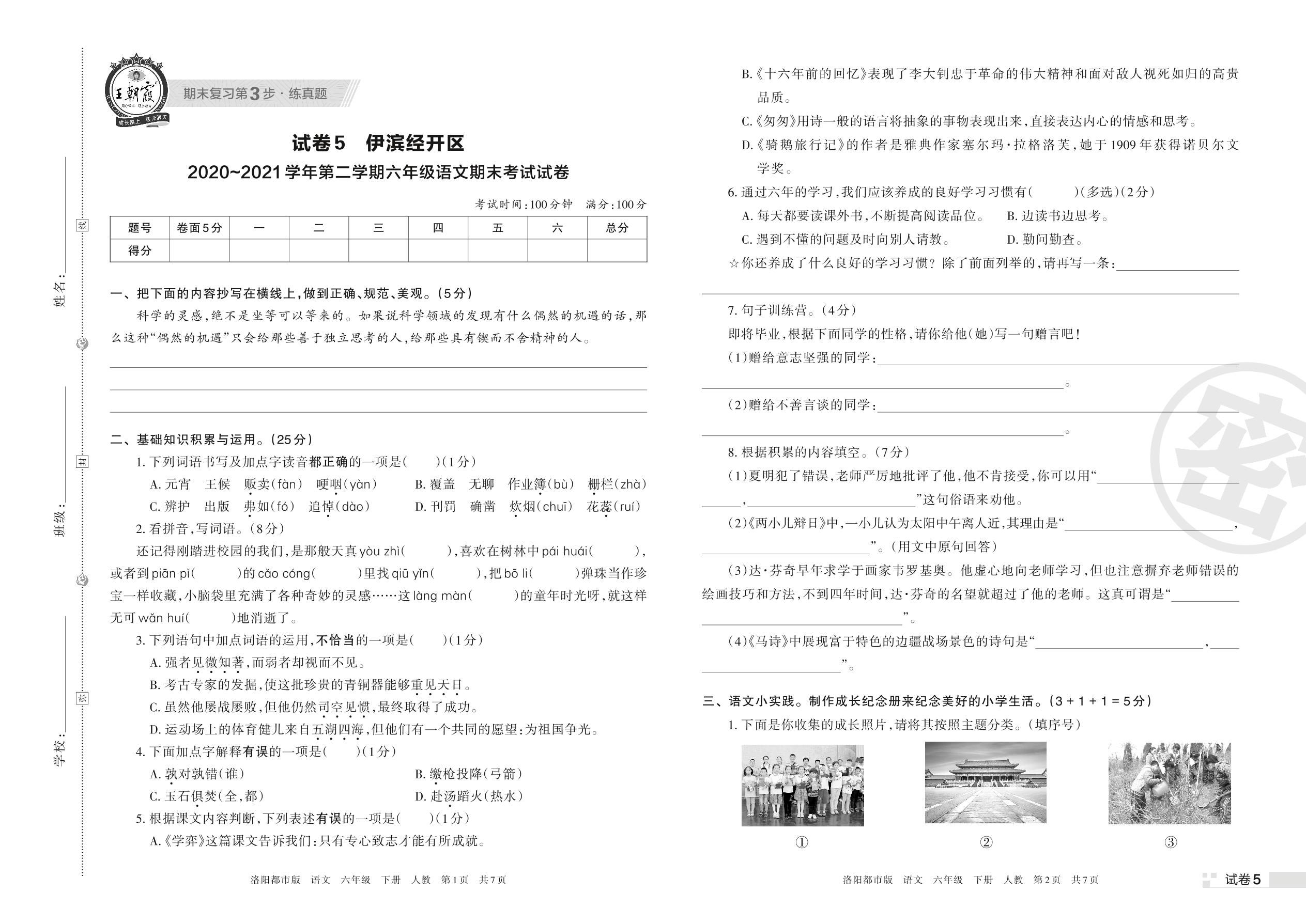 伊滨经开区2020~2021学年第二学期六年级语文期末考试试卷(人教版)【5】
