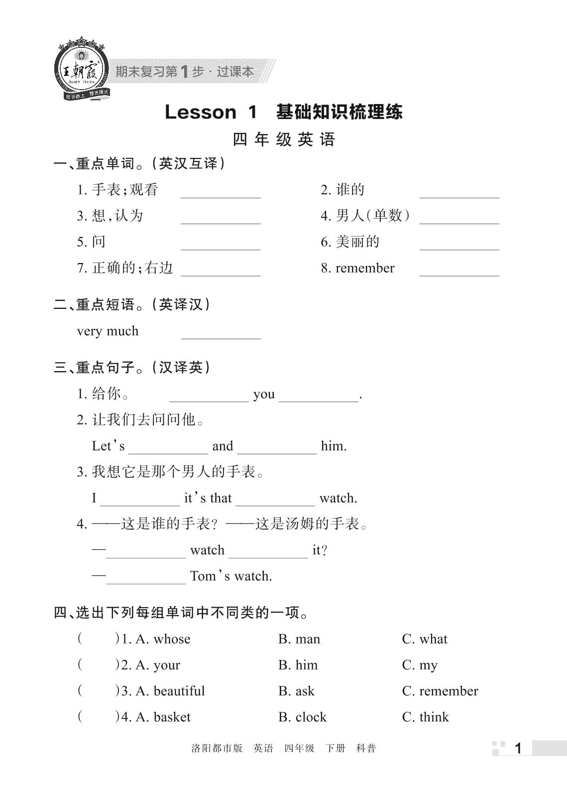 王朝霞期末过课本——Lesson 1 基础知识梳理练四年级下册英语(科普版)