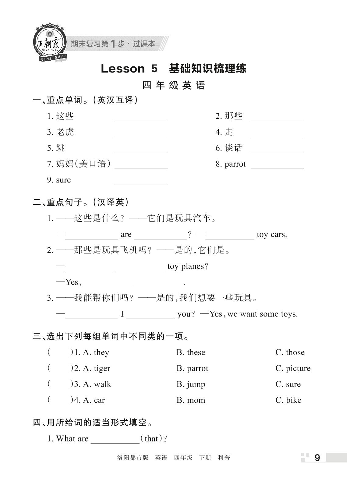 王朝霞期末过课本——Lesson 5 基础知识梳理练四年级下册英语(科普版)