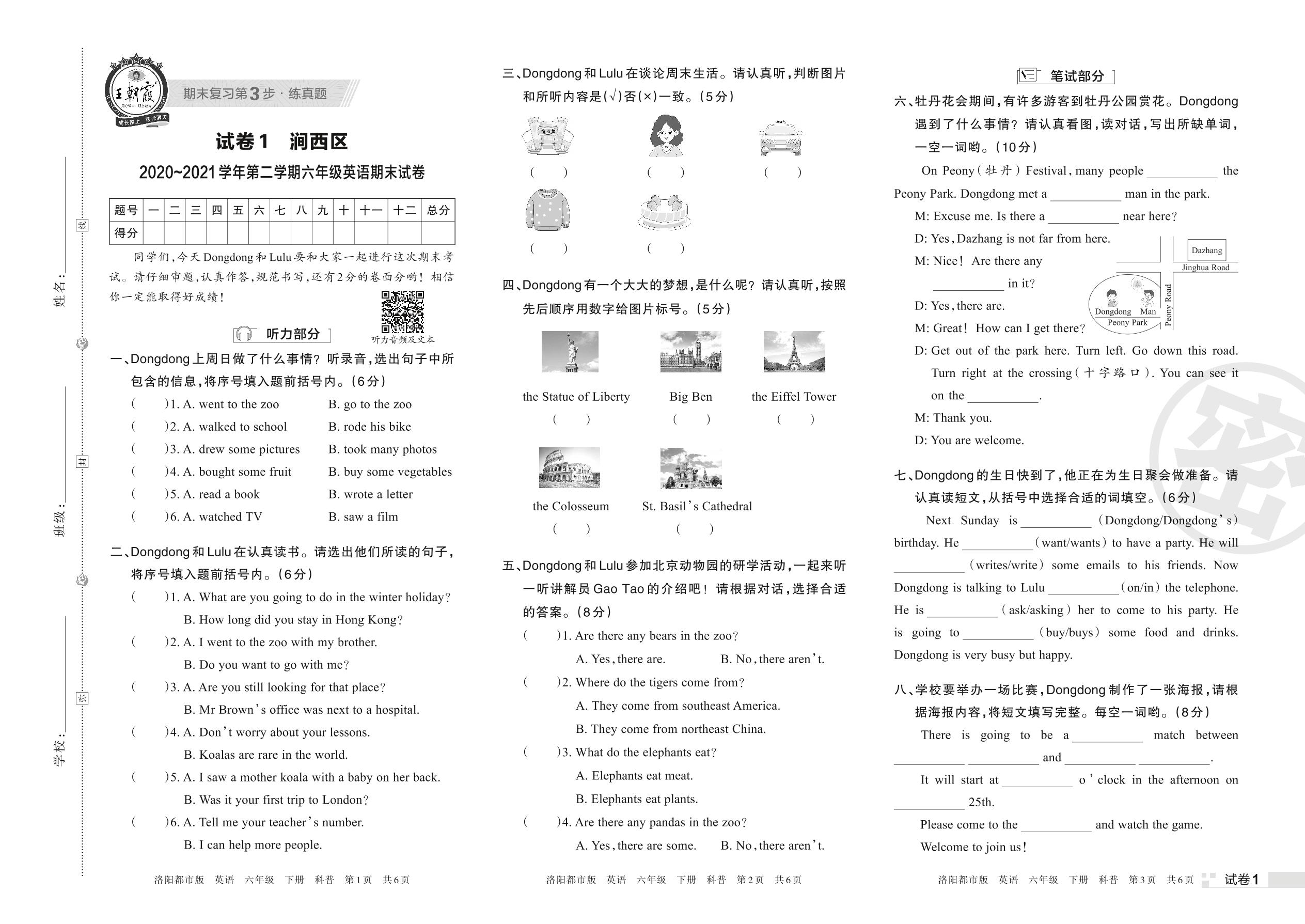涧西区2020~2021学年第二学期六年级英语期末试卷(科普版)【1】