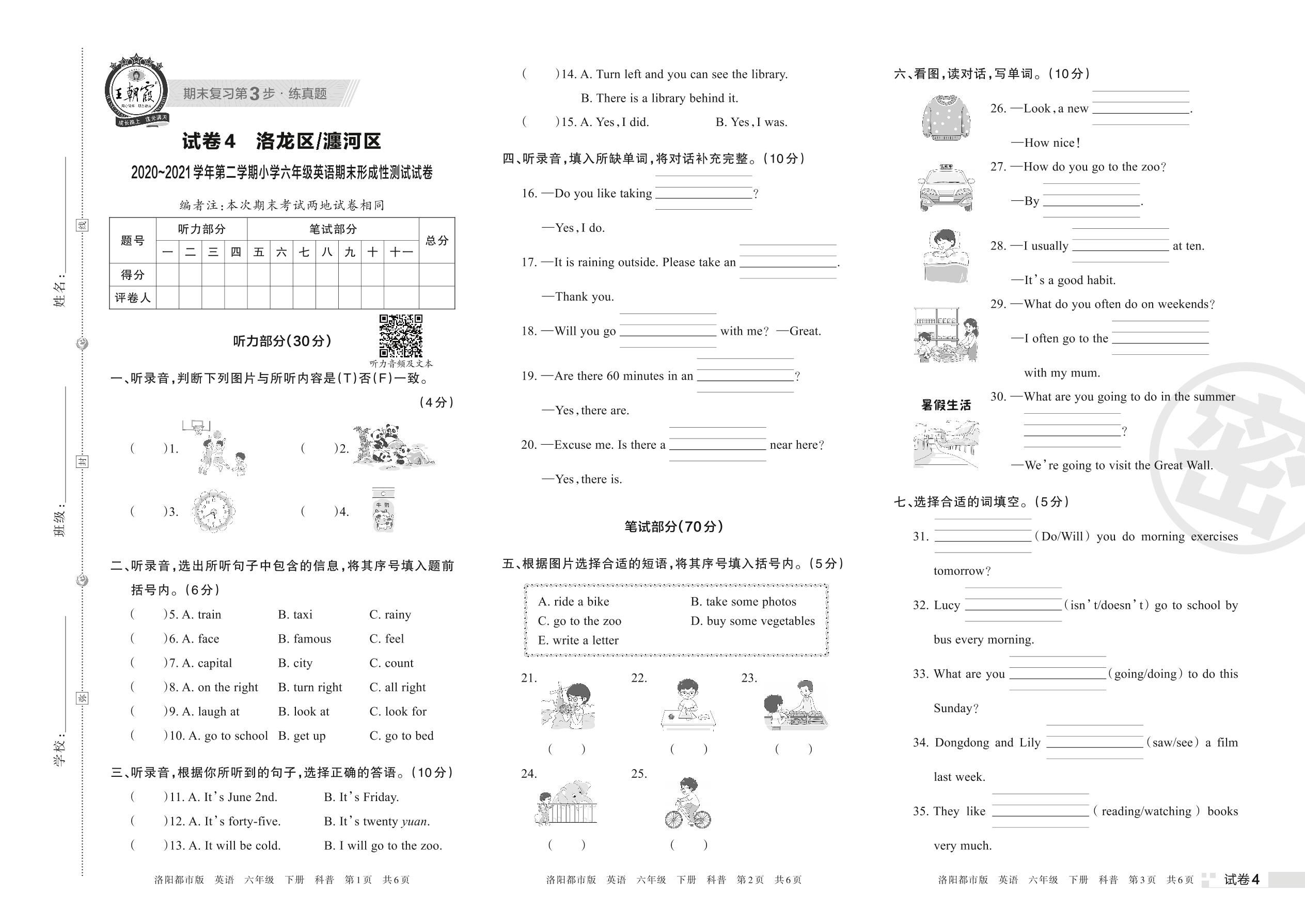 洛龙区、瀍河区2020~2021学年第二学期小学六年级英语期末形成性测试试卷(科普版)【4】