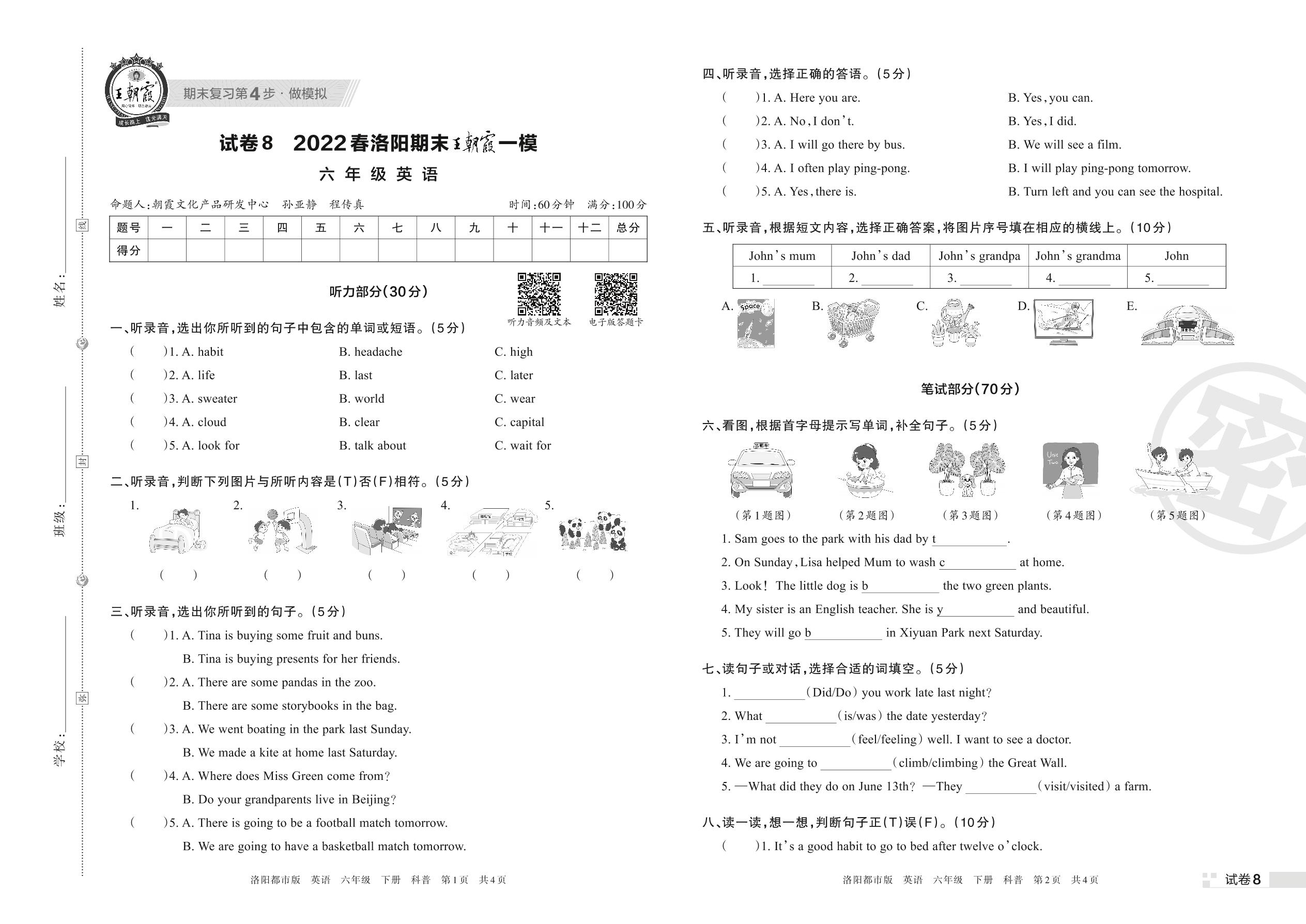 王朝霞期末模拟卷六年级下册英语(科普版)_R220331155856866【8】
