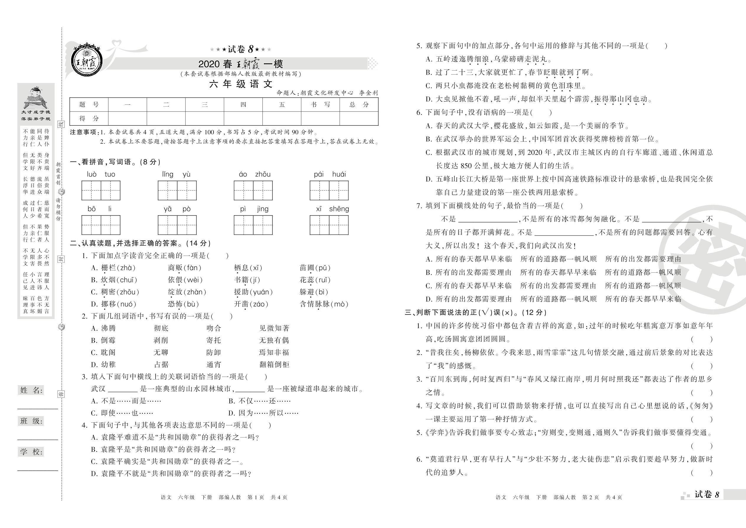 王朝霞期末模拟卷六年级下册语文(人教版)_R21080220713【8】