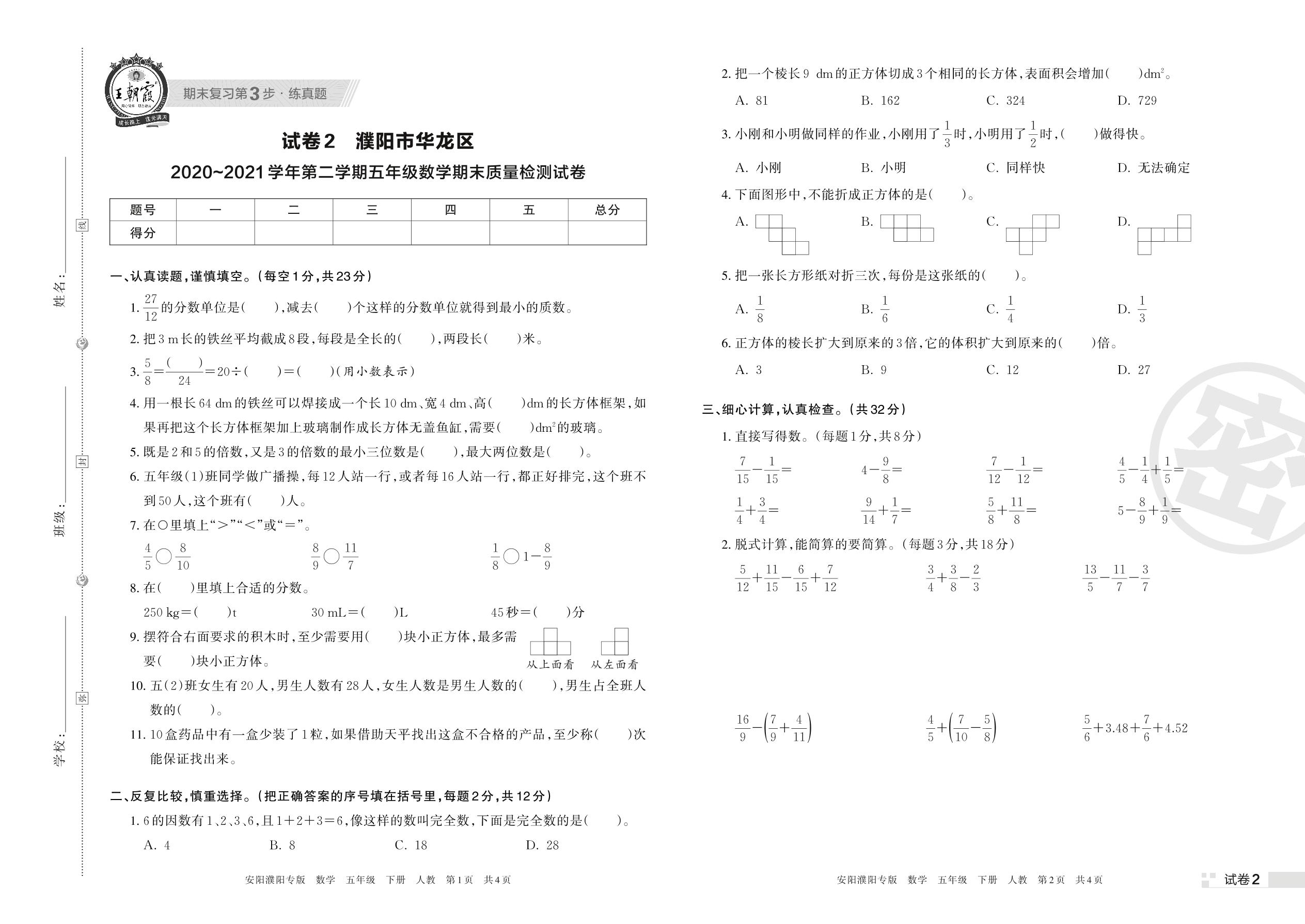 濮阳市华龙区2020~2021学年第二学期五年级数学期末质量检测试卷(人教版)【2】