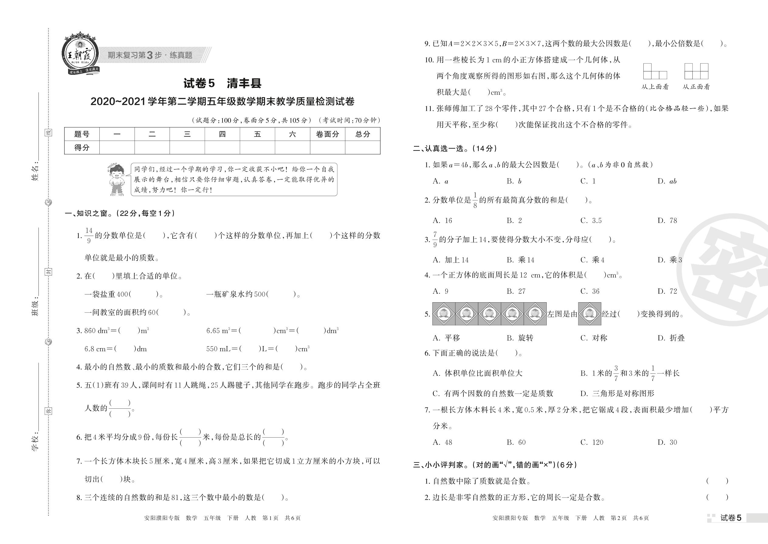 清丰县2020~2021学年第二学期五年级数学期末教学质量检测试卷(人教版)【5】