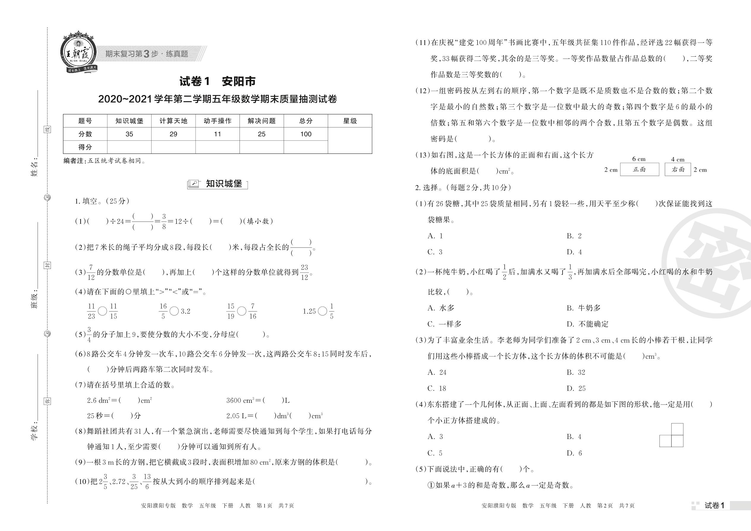 安阳市2020~2021学年第二学期五年级数学期末质量抽测试卷(人教版)【1】