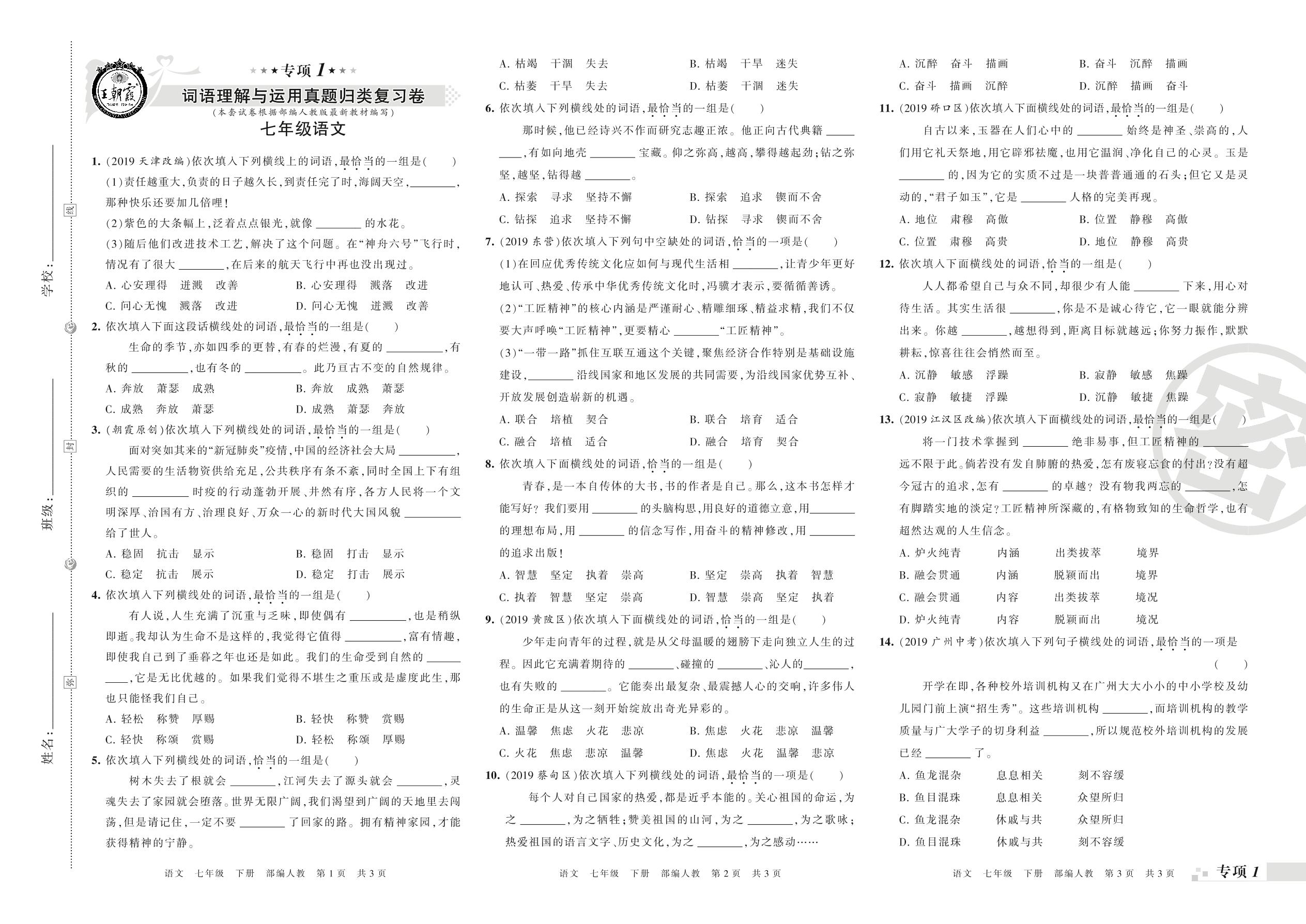 王朝霞期末专项卷——词语理解与运用、病句真题归类复习卷七年级下册语文(人教版)_R21080220733【0】