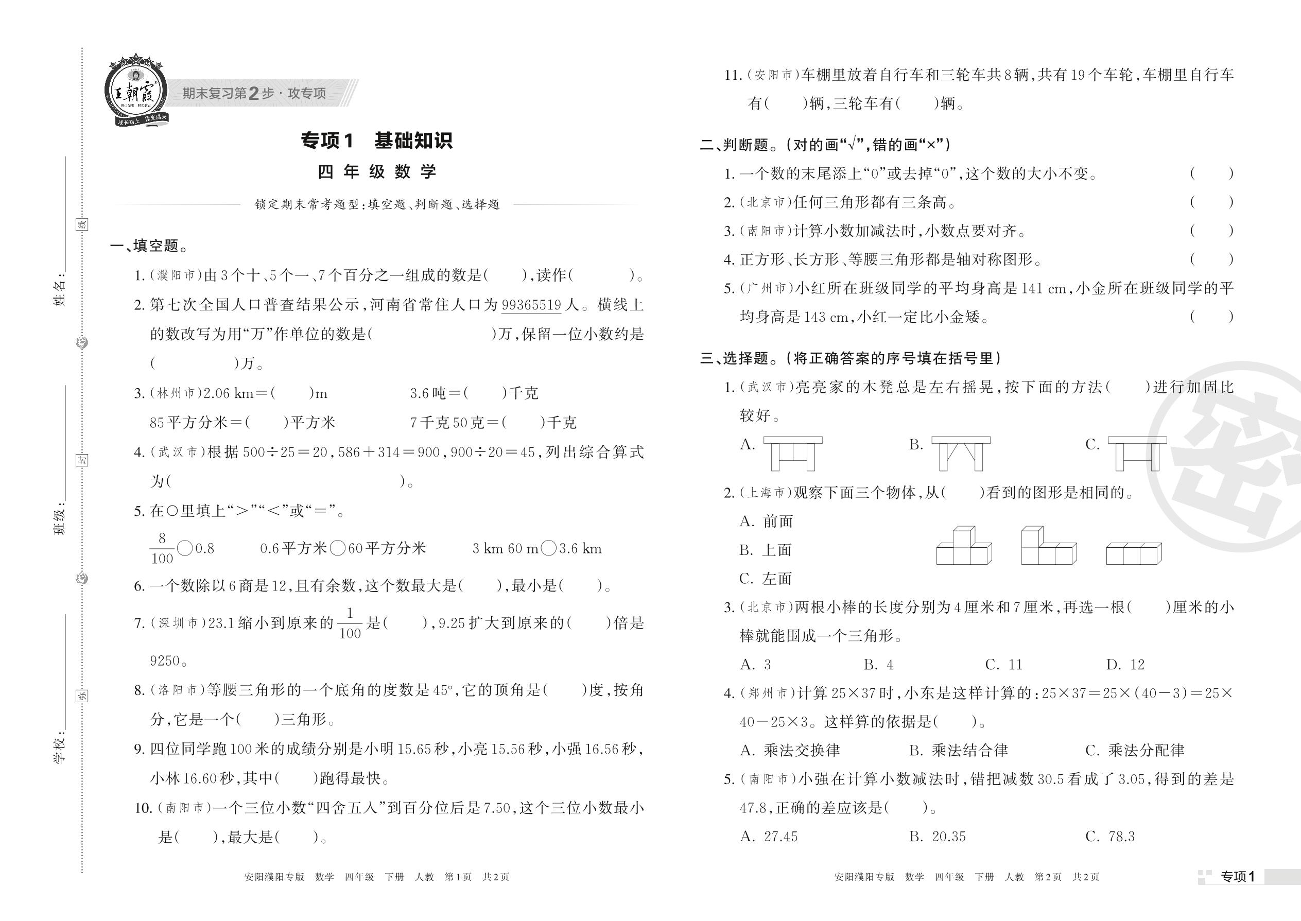 王朝霞期末专项卷——基础知识四年级下册数学(人教版)【1】1
