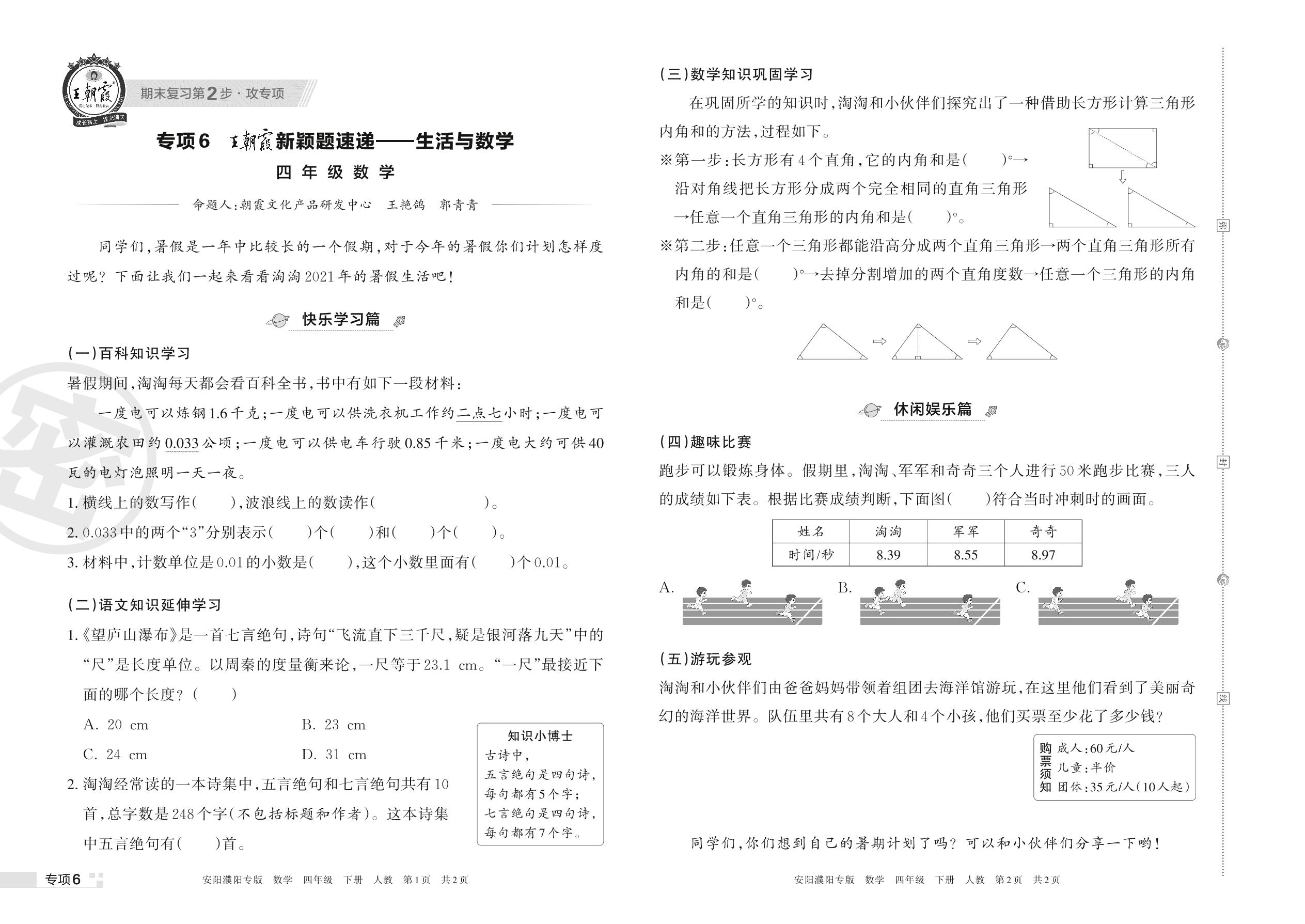 王朝霞期末专项卷——新颖题速递:生活与数学四年级下册数学(人教版)_R220406141441902【6】